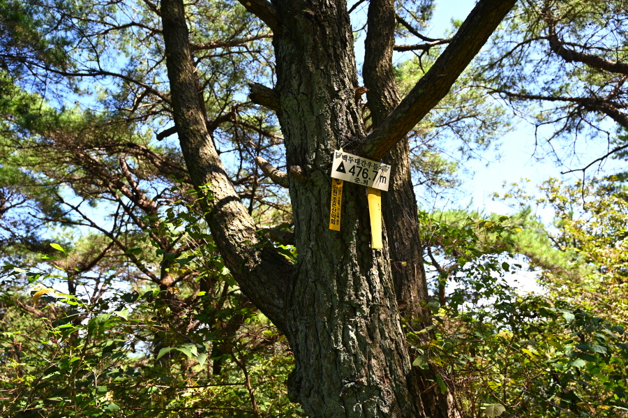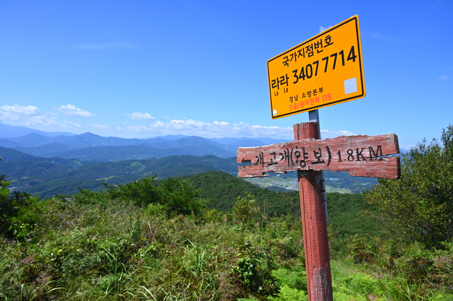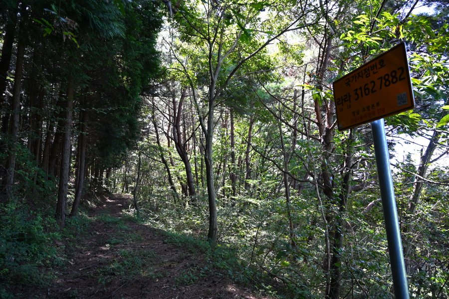 이제부터 일정한 거리를 두고 국가지점번호 표지판이 길잡이가 돼 줍니다. 산길은 자연스럽게 능선에 올라선 뒤 숲속을 파고 듭니다