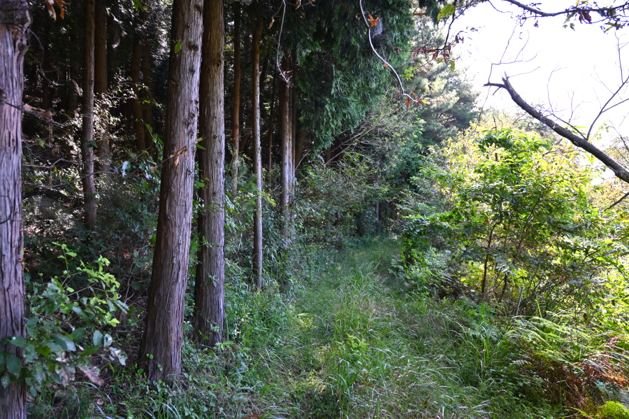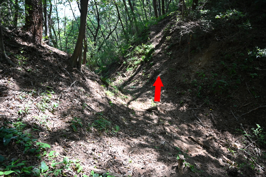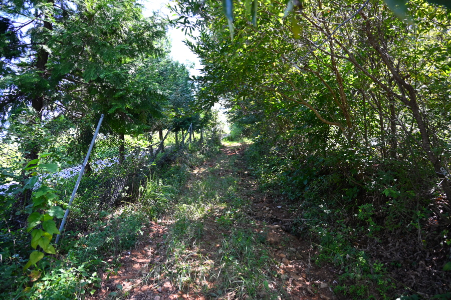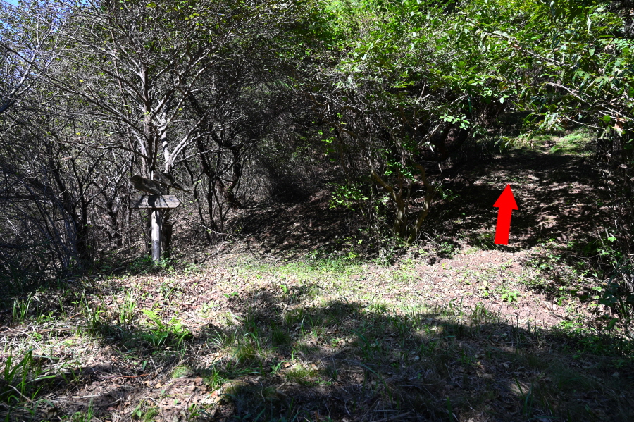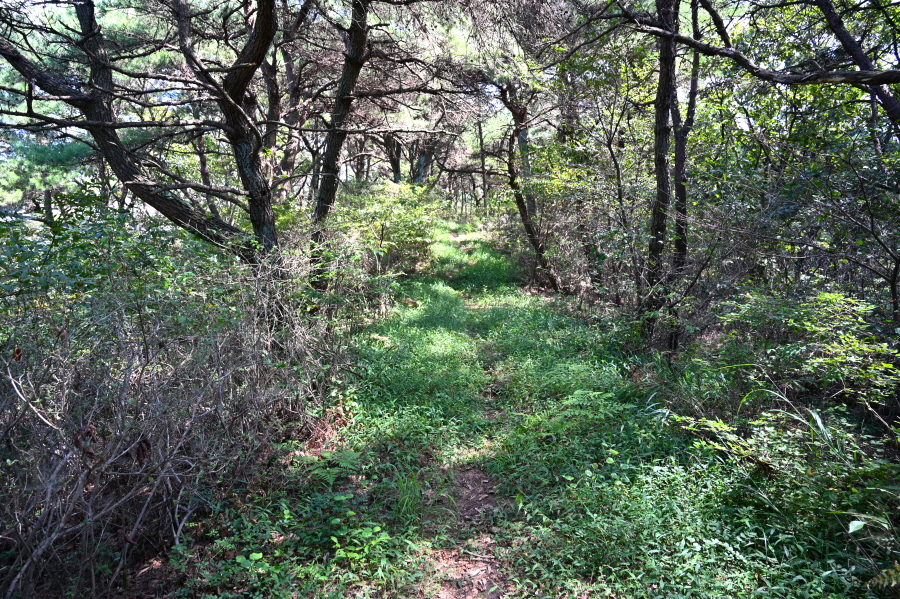 완만하게 능선을 오르내리는 걷기 좋은 오솔길이 한동안 이어집니다. 푹 파인 옛 고개 한 곳을 지나면 현위치 번호 이명산 1번 팻말이 섰습니다. ‘황토재 0.8㎞ 지점’입니다. 283.8봉을 지나 황토재에서 약 40분이면 사거리 안부인 살티재(사실재)에 내려섭니다.