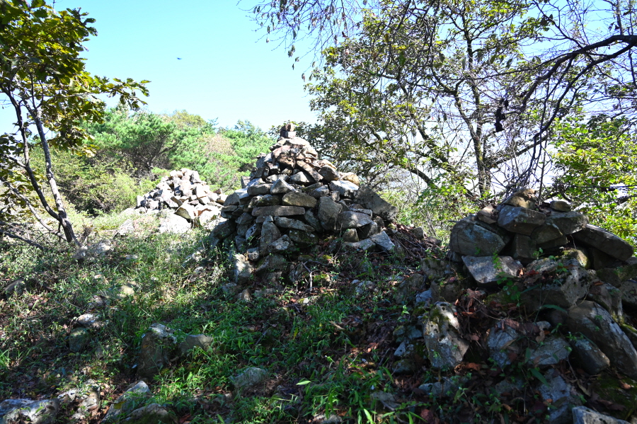 3,4개의 작은 돌탑이 서 있고 머리통만한 돌이 널려 있습니다. 주위에 이런 돌을 찾을 수 없었는데, 여기가 불에 달군 돌을 연못에 넣어 이무기를 쫒아버렸다는 그 곳이 아닐까 하는 생각이 들었습니다.