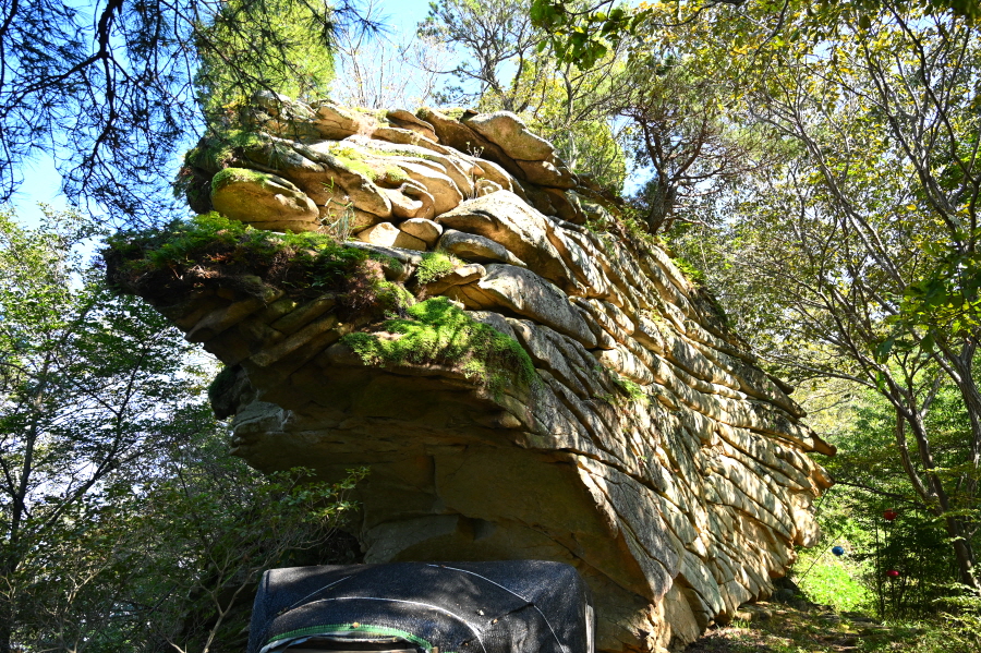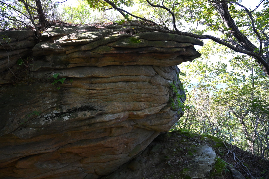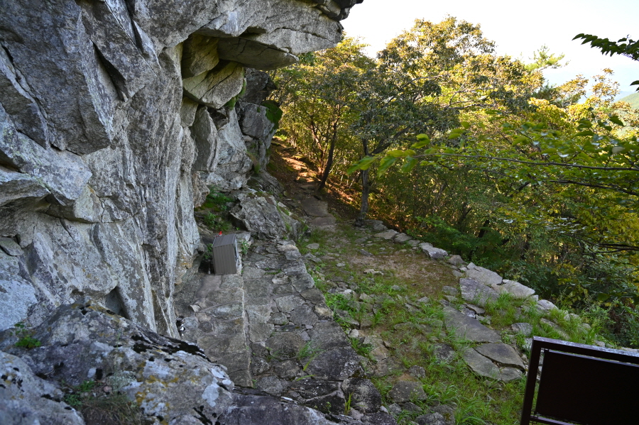 취재팀은 시루떡바위를 보려고 수련원(0.7㎞)으로 직진했습니다. 시루떡을 겹겹이 포갠 듯한 두 개의 바위를 지나 약 10분이면 안부 갈림길에 닿습니다. 오른쪽 수련원으로 내려갑니다. 대중교통으로 왔다면 직진해 계명산을 넘어 코스모스 축제장(직전마을)이 있는 북천역으로 바로 갑니다.