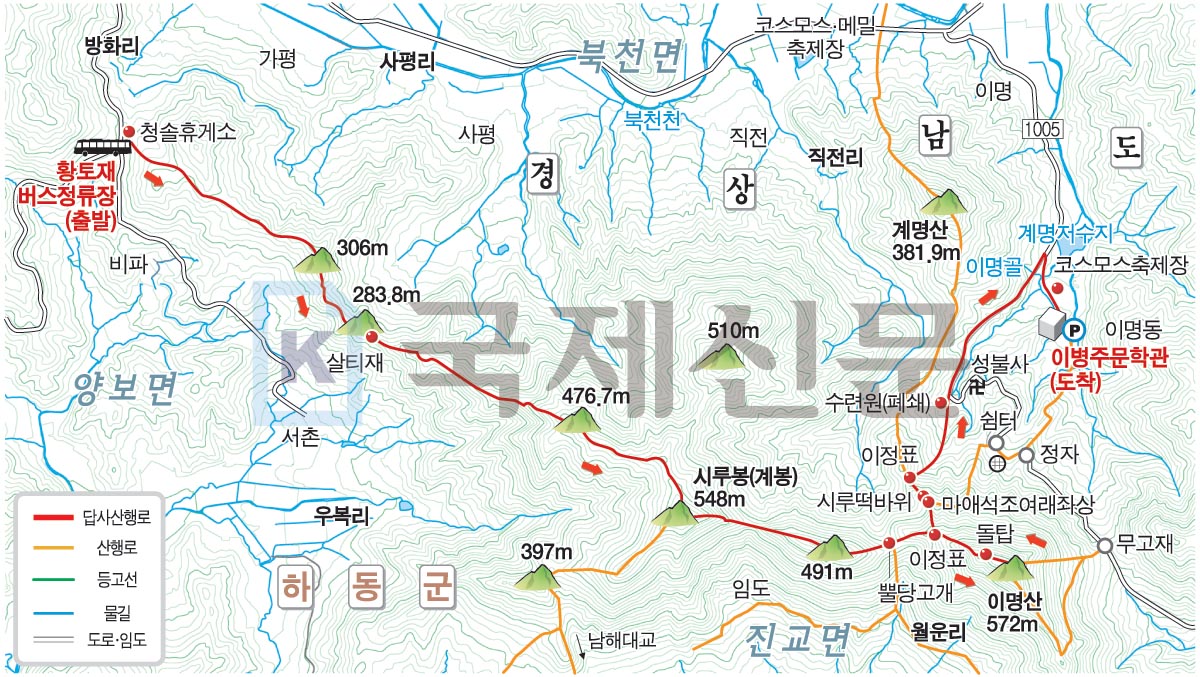 산행 경로는 다음과 같습니다. 황토재 버스정류장~283.8봉~살티재(사실재)~삼각점봉(476.7m)~시루봉 정상~뿔당고개~이명산 정상·마애불 갈림길~이명산 정상~(이명산 정상·마애불 갈림길)~마애불~시루떡바위~수련원·코스모스축제장(직전마을) 갈림길~1005번 지방도(곤북로)~이명골마을 문학관 입구~이병주문학관에 도착합니다. 산행거리는 안내도 거리 기준 약 8.5㎞이며, 4시간30분 안팎 걸립니다.