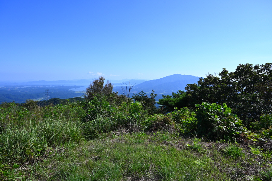 북서쪽으로 지리산 천왕봉이 우뚝하고 시계방향으로 중봉 웅석봉 황매산 자굴산 이명산 와룡산 각산 사천만 대방산 금산 호구산 금오산 광양만 억불봉 백운산 구재봉 칠성봉 삼신봉 영신봉 촛대봉 제석봉 등 높고 낮은 산이 파노라마로 펼쳐집니다. 천왕봉 앞으로 봉긋하게 솟은 세 산은 주산 구곡산 옥산입니다.
