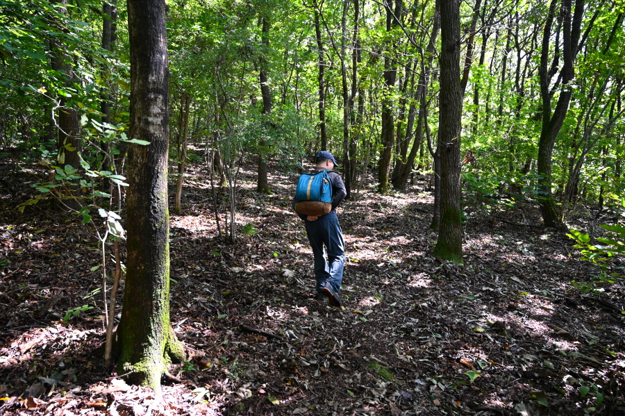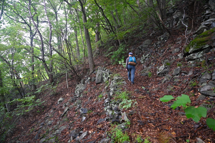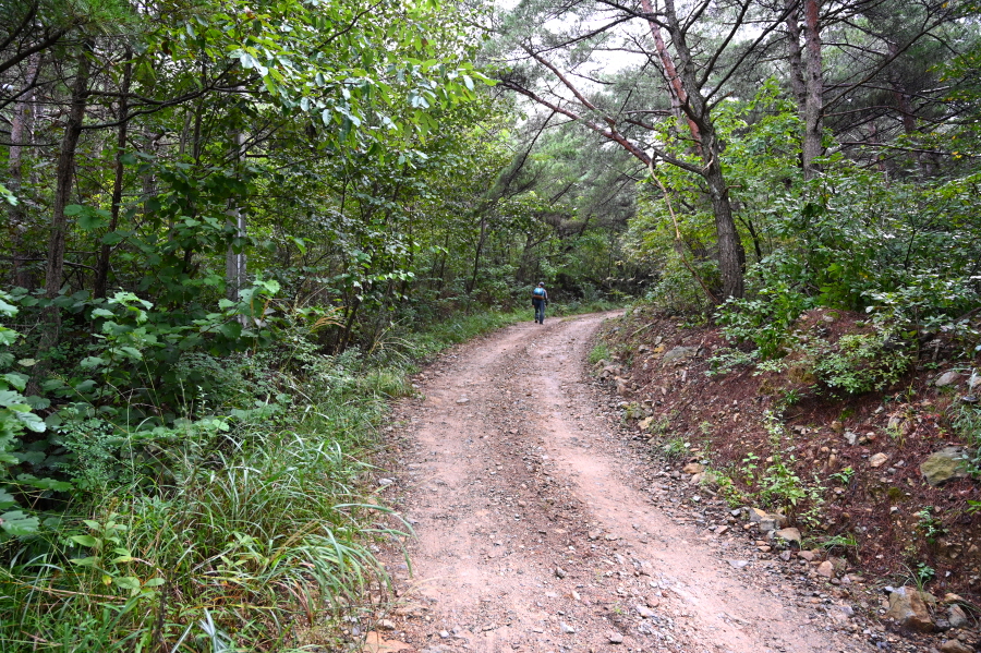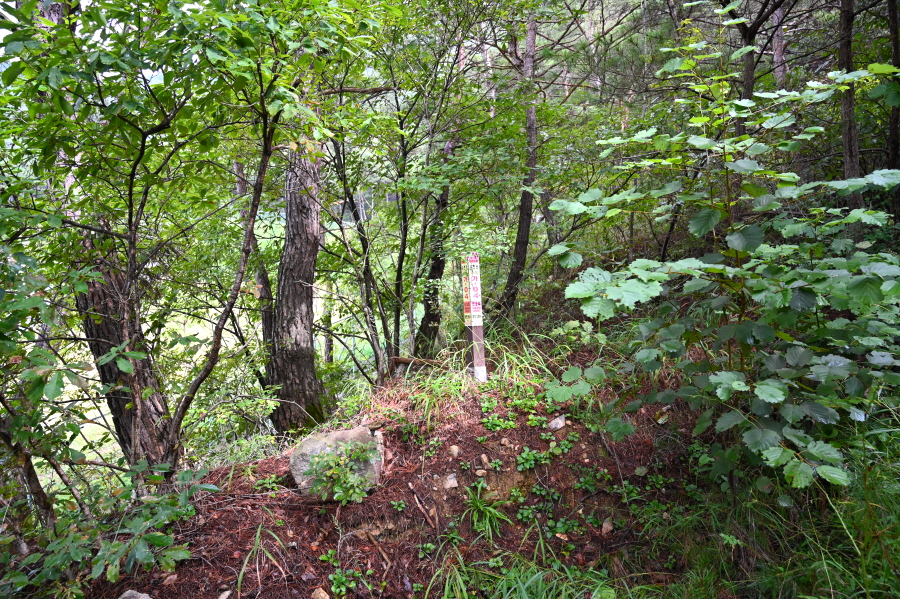 지그재그 길을 내려가면 산길은 완만해지고 무덤 세 기를 지나 약 40분이면 도로와 만납니다.
