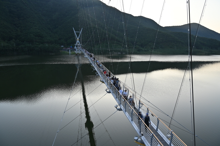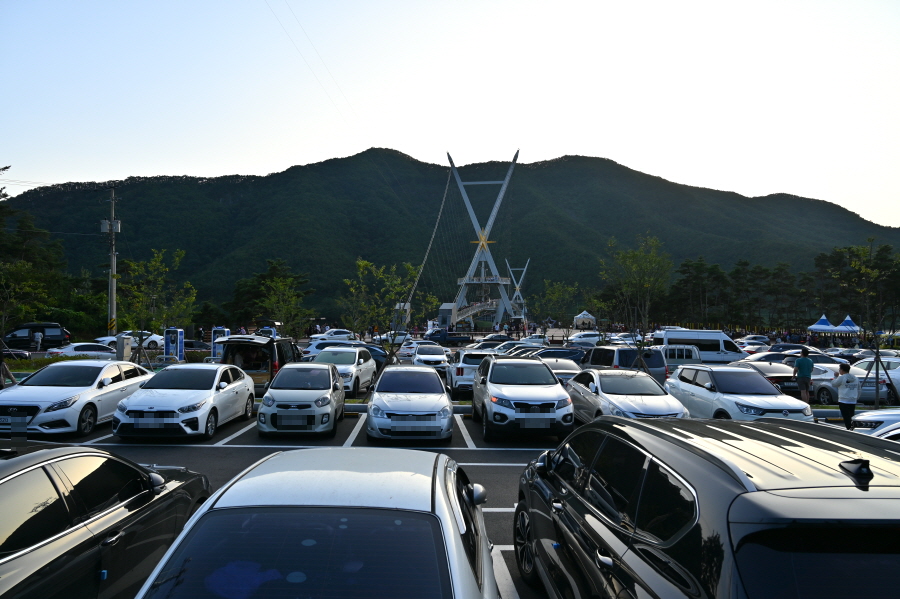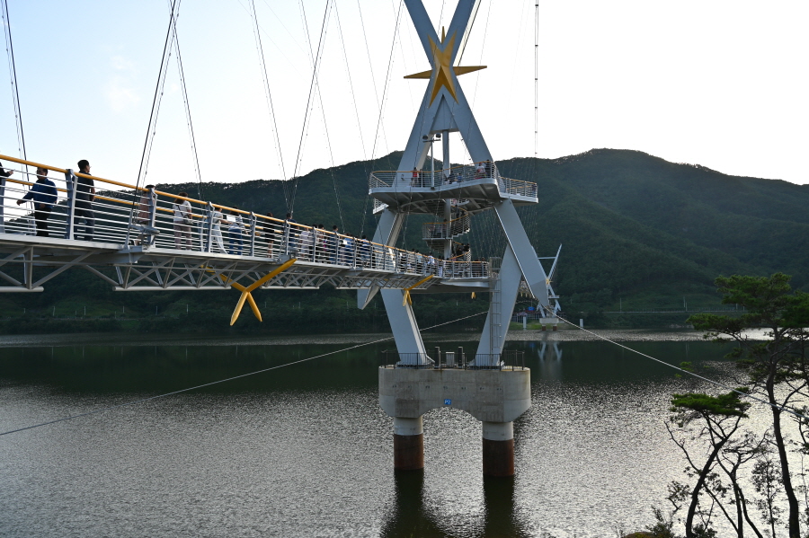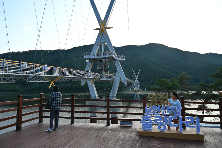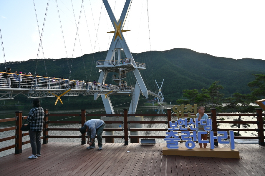 보현산다목적댐은 용수공급과 홍수조절, 소수력 발전을 목적으로 2014년 완공했습니다. 특이하게도 길이 250m 의 아치형 콘크리트 중력식 댐으로 건설되었습니다. 호수의 양쪽을 연결하는 보현산댐 출렁다리는 2주탑 현수교 방식에 X자형 주탑은 별을 형상화 했습니다. 출렁다리와 주탑에 야간 조명을 달아 만수위인 보현산댐과 어우러져 멋진 야경을 연출합니다,