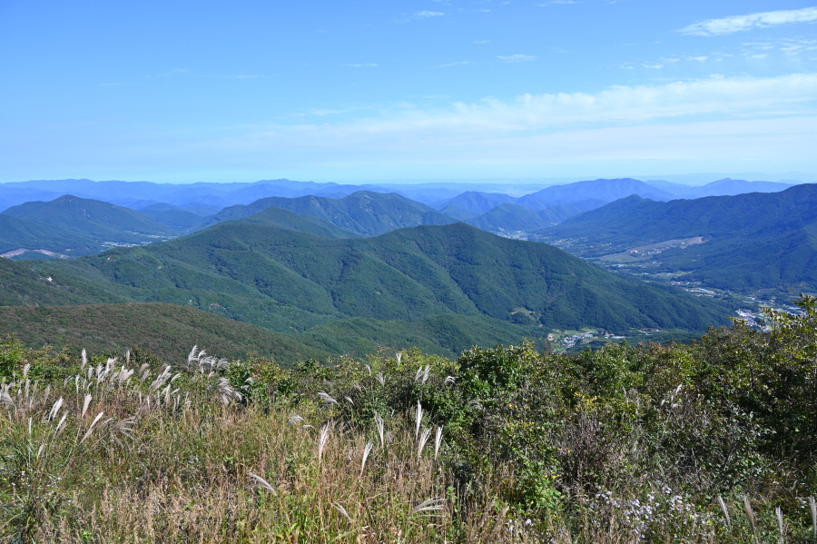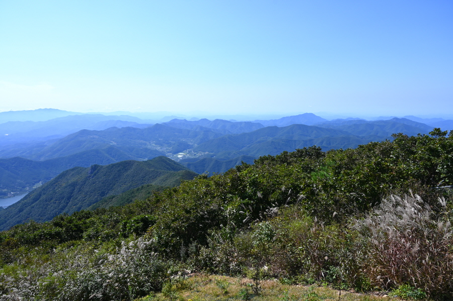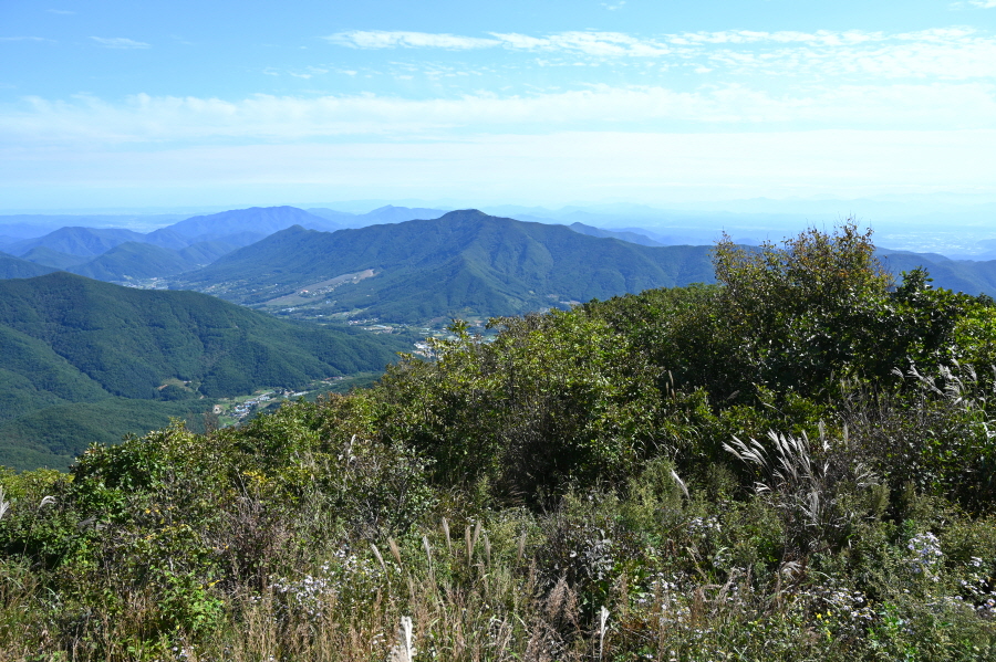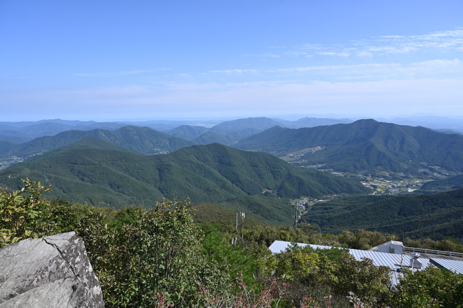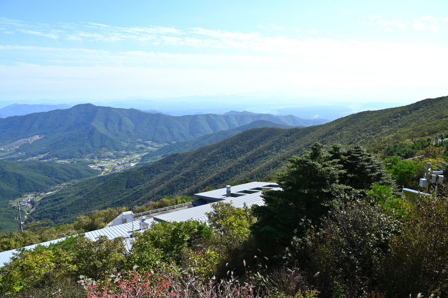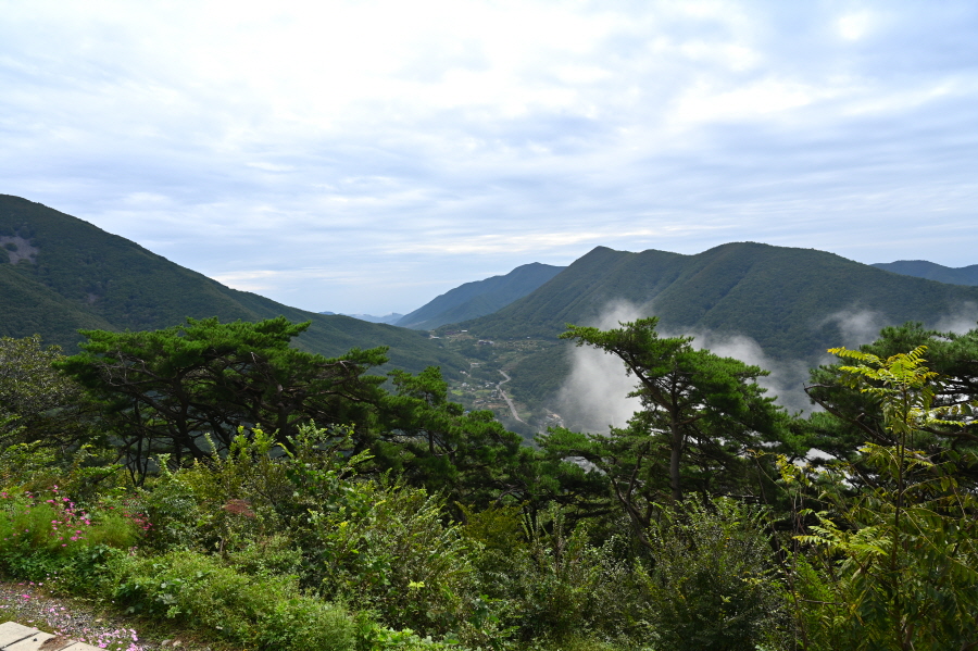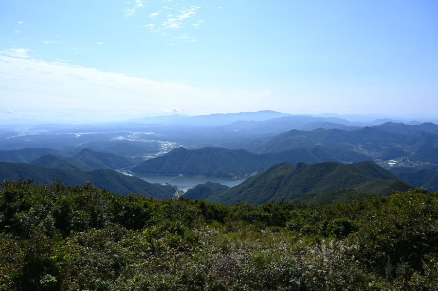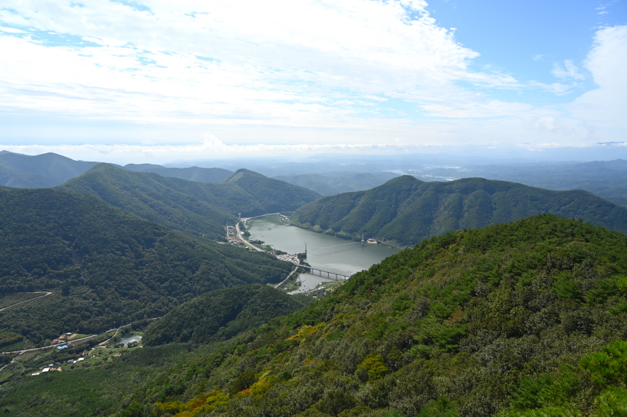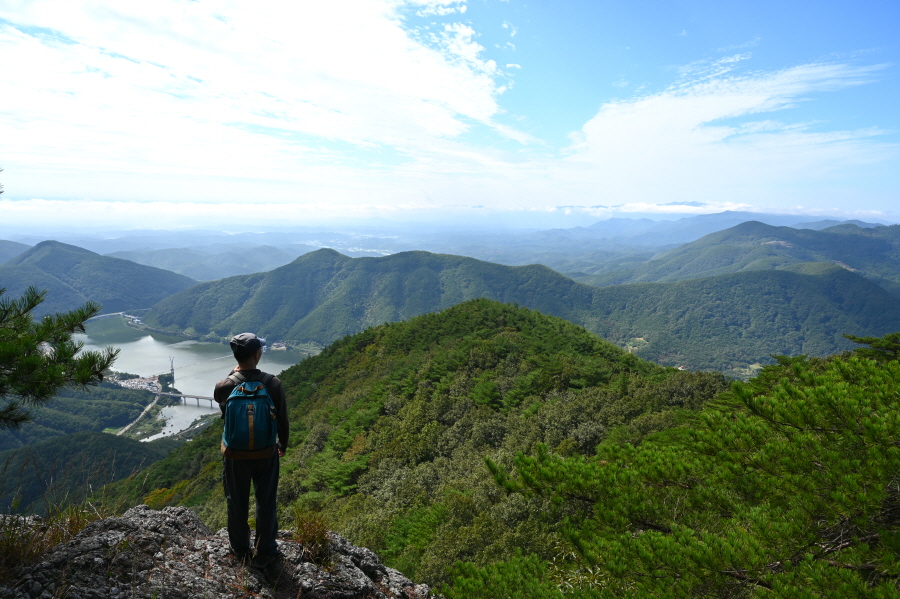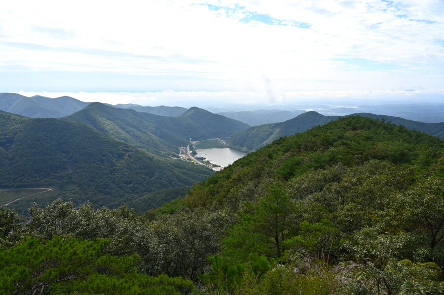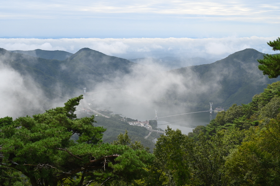 지대가 높고 앉은 자리가 명당인 만큼 조망이 시원하게 열립니다. 아침에 비가 내려서 그런지 남쪽으로 운해가 뒤덮습니다. 오른쪽 발아래 보현산댐을 가로 질러 출렁다리가 걸려 있고, 왼쪽에는 필자가 하산할 간여재 뒤로 기룡산이 보입니다.