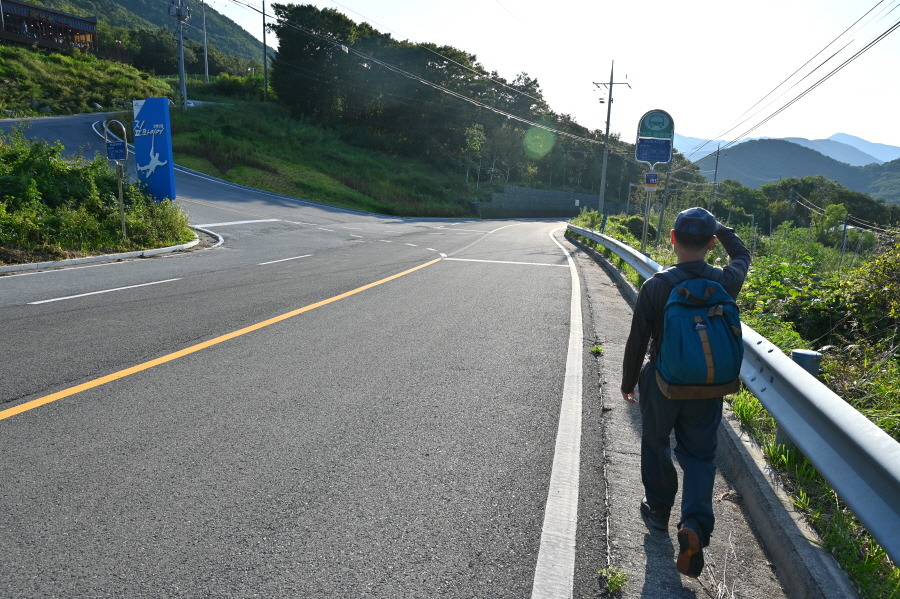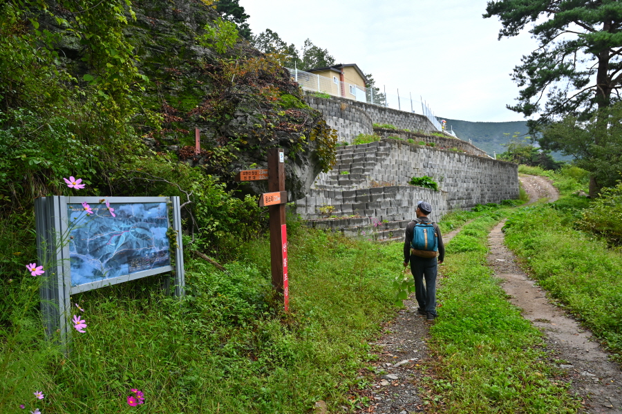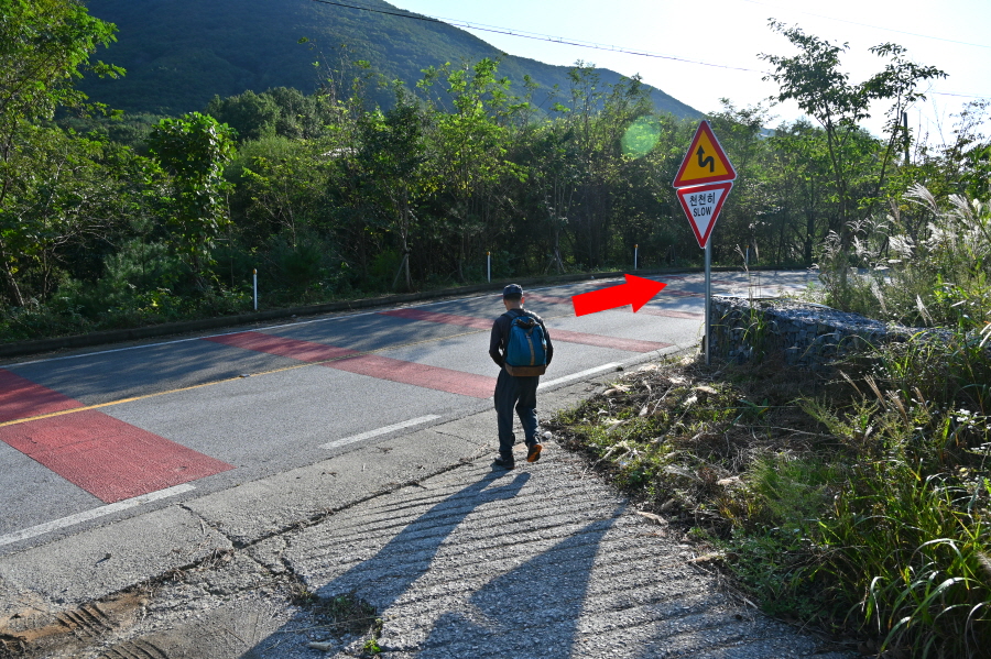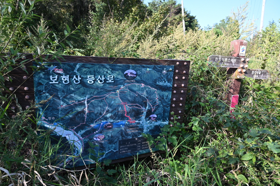 이정표와 안내도는 풀숲에 가려 있습니다. 보현산댐 출렁다리는 오른쪽 간여재 방향으로 도로를 걷습니다. 왼쪽은 정각마을로 갑니다.