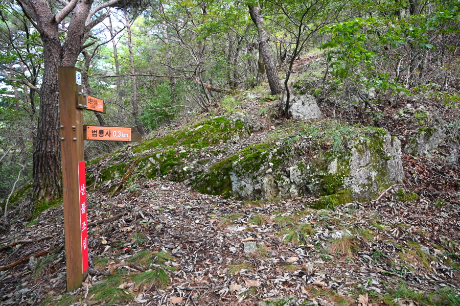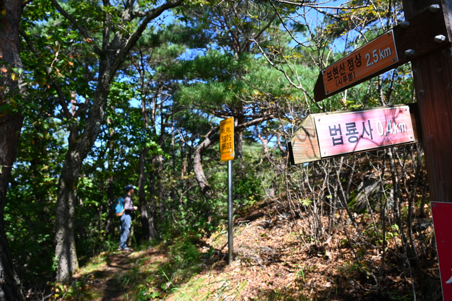 ‘현위치번호 보현산 가04’ 팻말을 거쳐 ‘부약산 법용사 가는 길’ 표석을 지나갑니다. 길가 상수리나무와 활엽수 잎은 가을빛이 묻어나 곧 붉고 노란 물로 화려하게 치장할 것 같습니다.