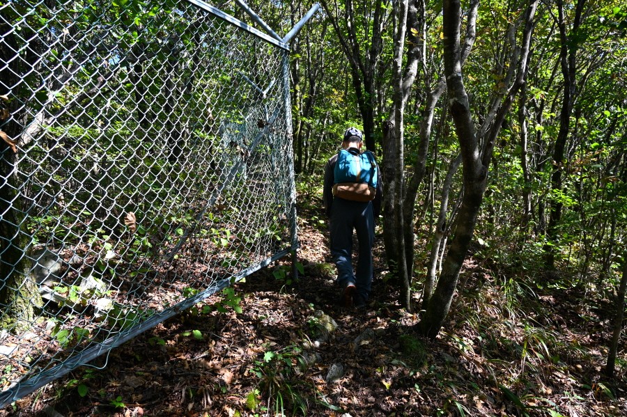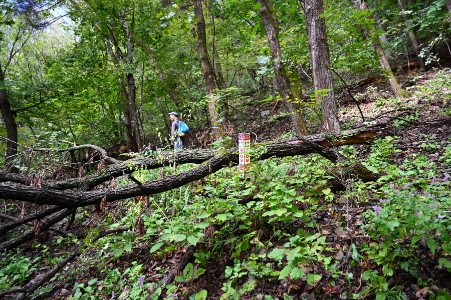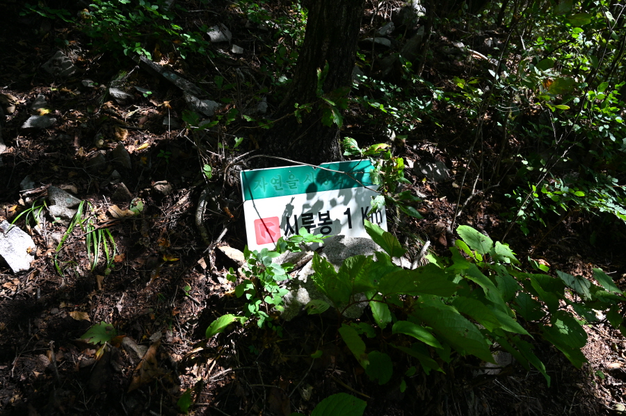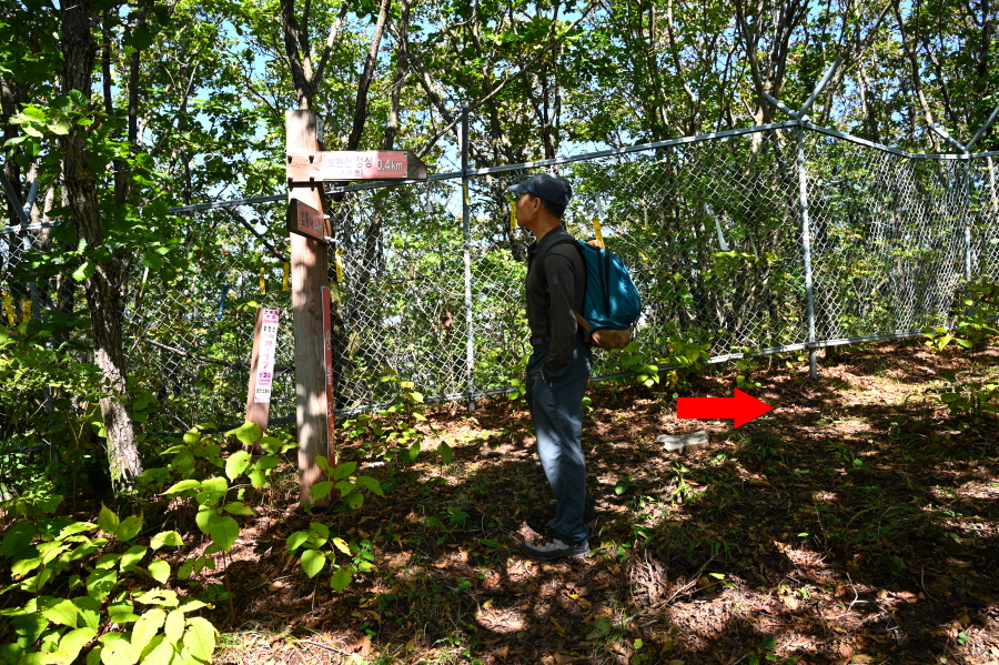 땅에 놓인 시루봉 1.0㎞ 안내판을 지나 약 50분이면 철망 울타리가 쳐진 보현지맥 갈림길에 닿습니다. 보현산 정상(시루봉·0.4㎞)은 오른쪽입니다. 왼쪽은 청송과 영천의 경계인 노귀재에서 올라오는 길.