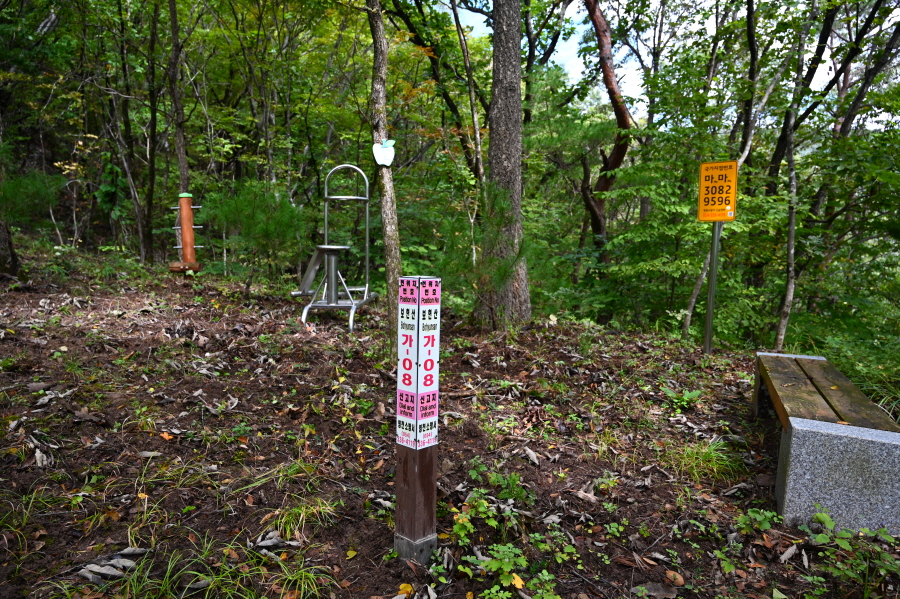 무인 산불 감시 카메라를 지나 ‘현위치 번호 보현산 가22’ 팻말에서 오른쪽 용소리로 내려가는 가지능선 입구에 산행리본이 달려 있으나 무시하고 직진합니다.