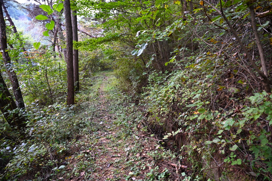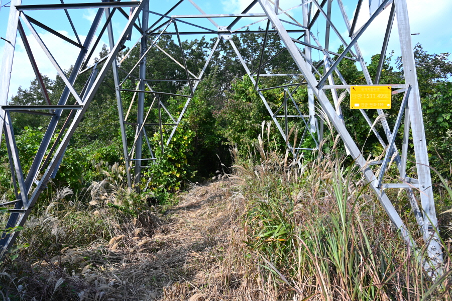 등산객이 많이 다니지 않아서 그런지 건너면 능선에서 이방인을 경계하는 듯 멧돼지 울음소리가 쩌렁쩌렁하게 들립니다. 쭉쭉 뻗은 아름드리 참나무가 능선에 늘어섰고 단풍나무도 보입니다. 약 15분이면 두 번째 철탑을 지납니다.