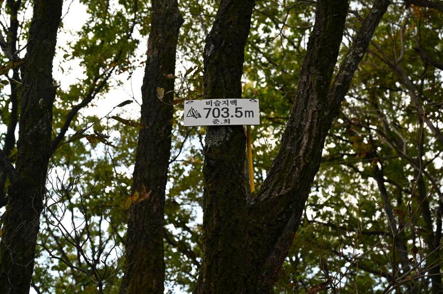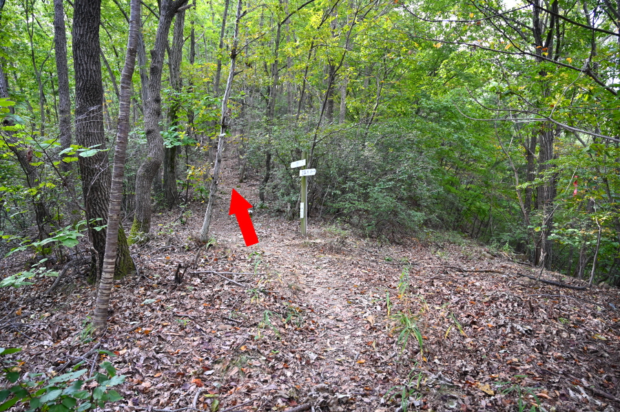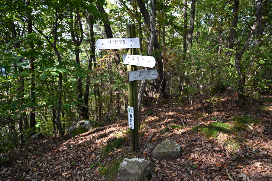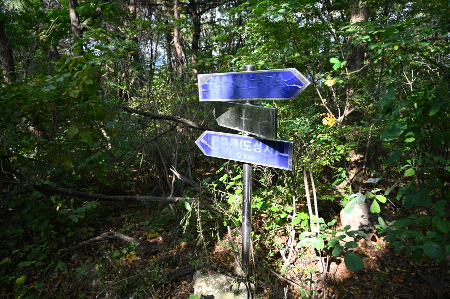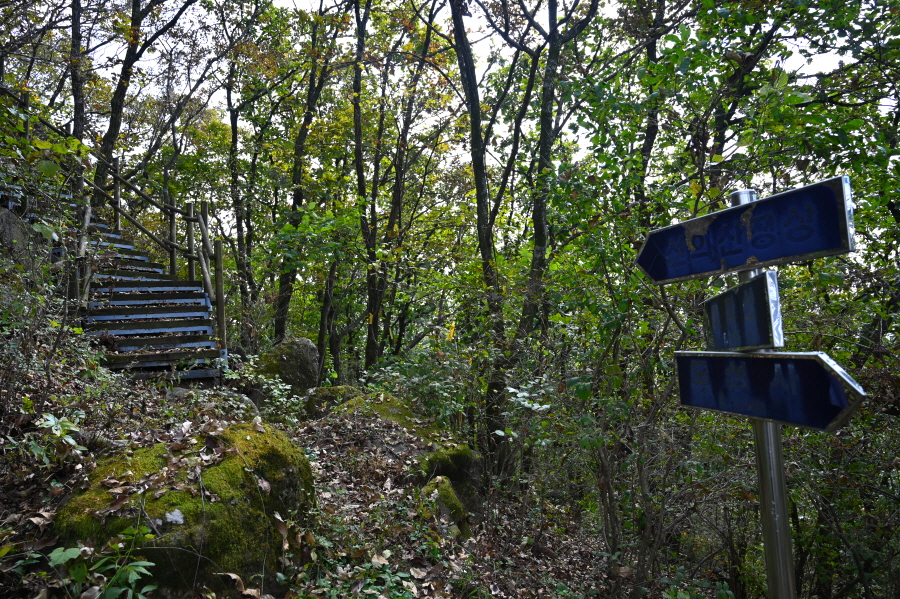 15분이면 이정표가 섰는 도성사 갈림길에 닿습니다. 필자는 신방리 방향으로 직진해 시루바위(703.5m) 전망대를 갔다 옵니다
