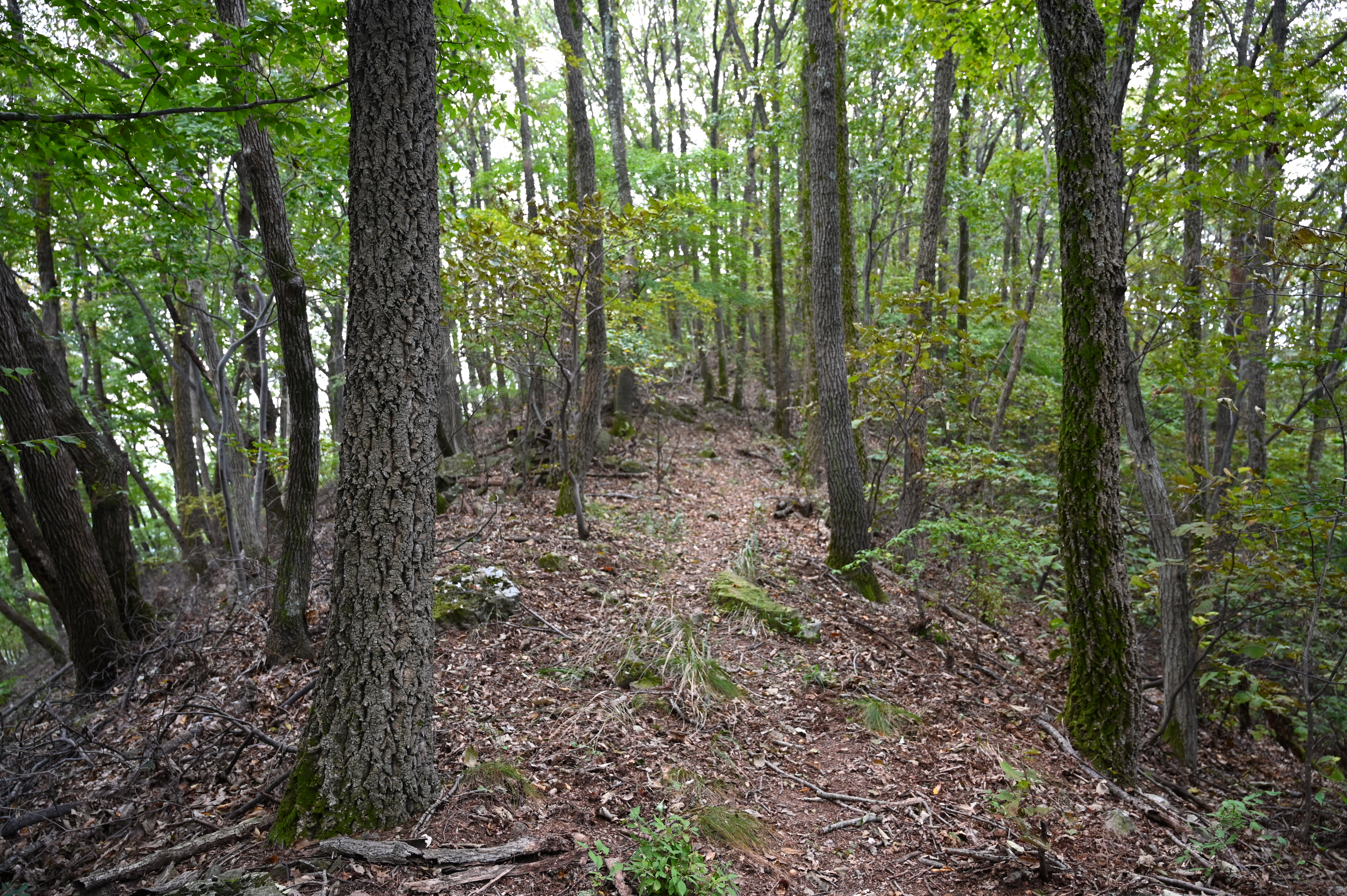 하산은 동쪽으로 덱 계단을 내려갑니다. 참나무와 활엽수가 빼곡한 완만한 능선을 탑니다.
