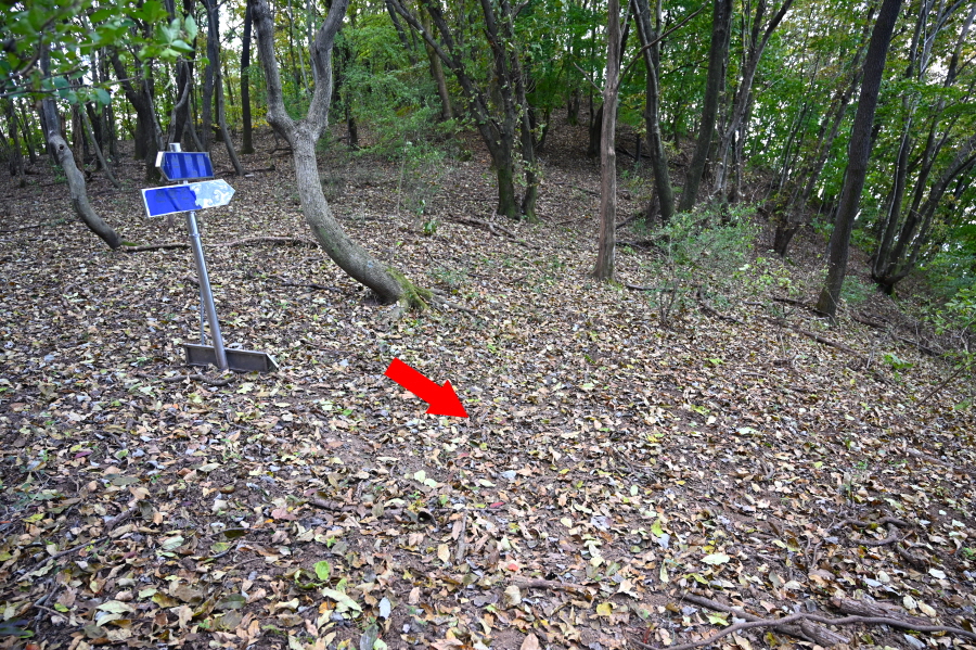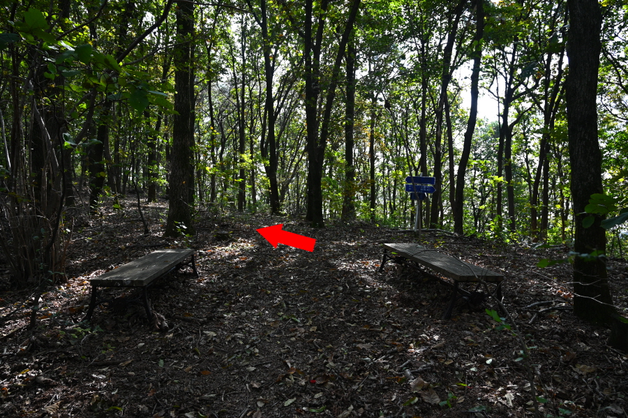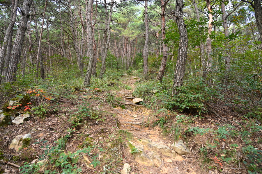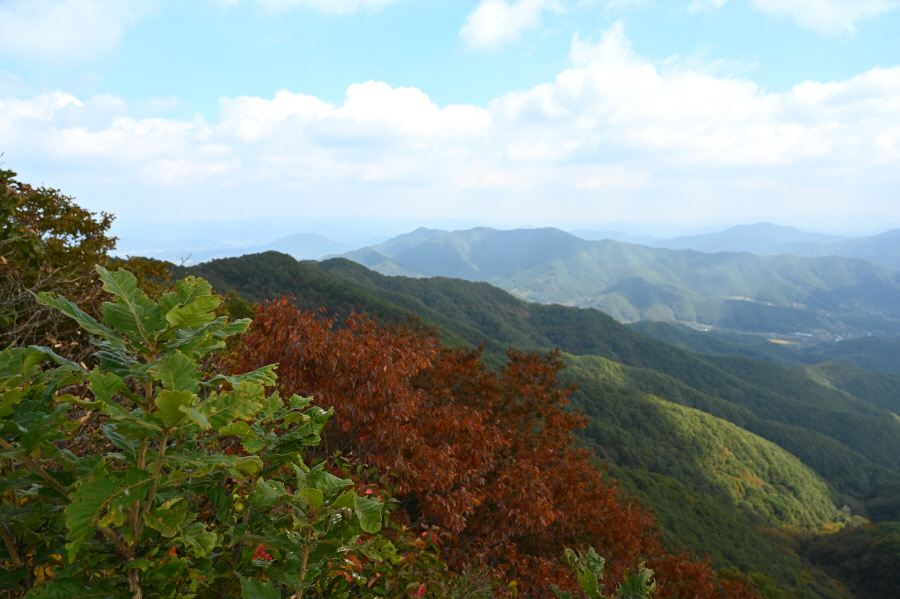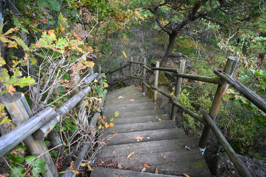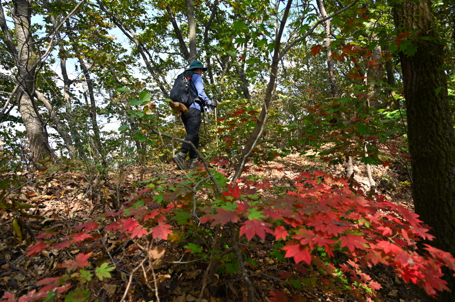 산길은 더욱 완만해지며 능선에 중간 중간 휴식을 취하는 나무 벤치도 설치돼 있습니다. 정상이 가까워지니 나뭇잎은 붉고 노란 물이 들었습니다.