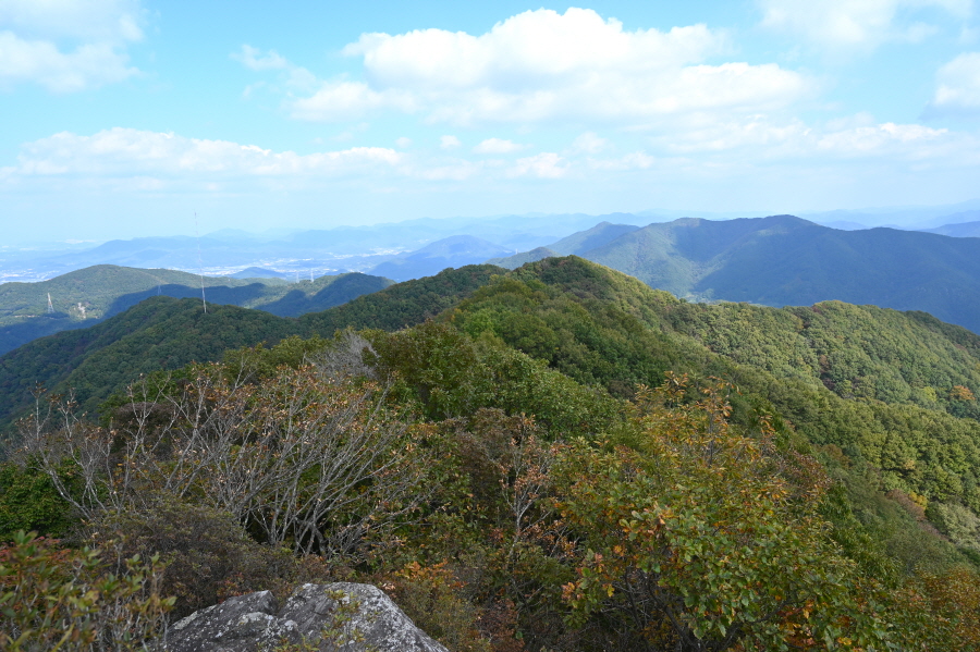 경산시의 주산이지만 조망은 남쪽인 청도 방향으로 열립니다. 덱 전망대에 서면 왼쪽으로 대왕산이 보이고 시계방향으로 천주산 학일산 통내산 호랑산 비룡산 시루봉과 용각산 뒤로 청도 남산과 화악산이, 멀리 사룡산과 구룡산 그리고 가지산 운문산 등 영남알프스 준봉들이 하늘금을 긋습니다.