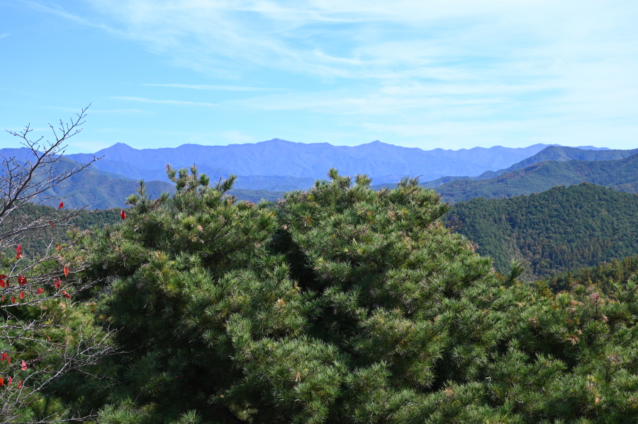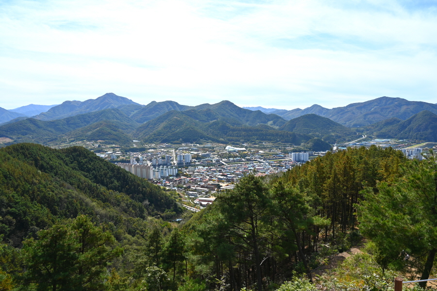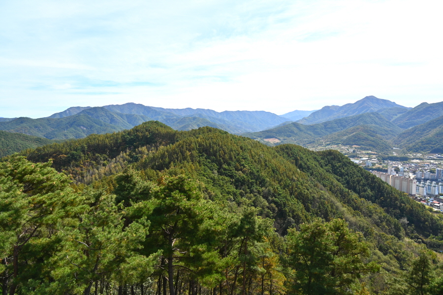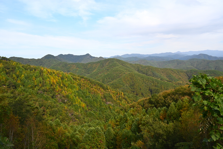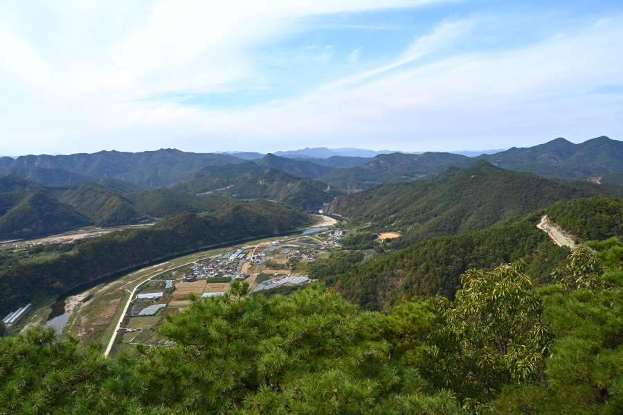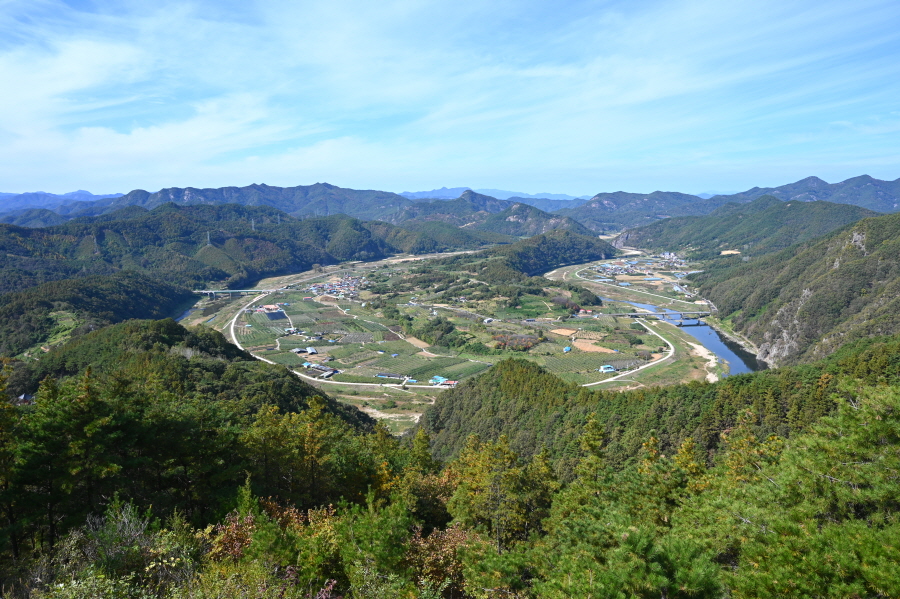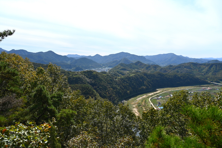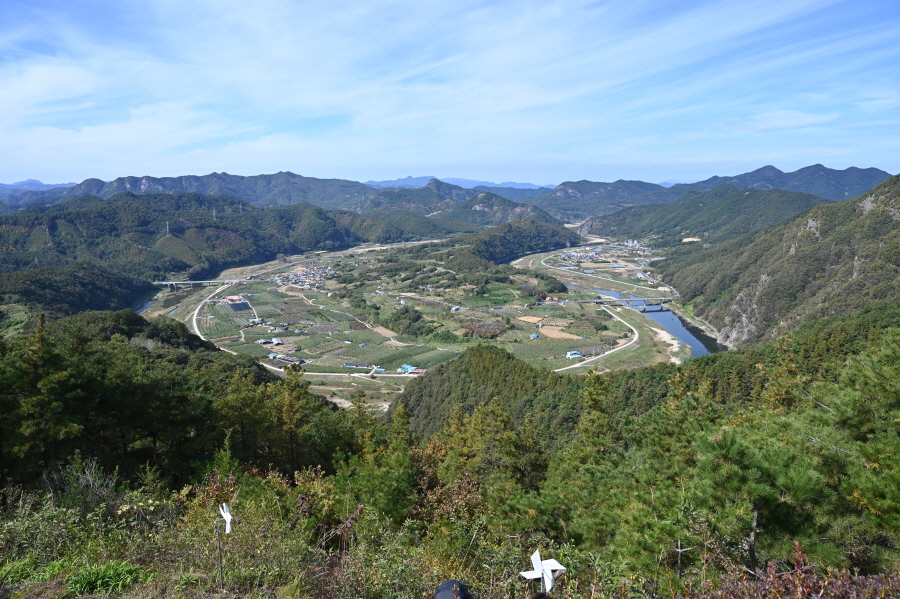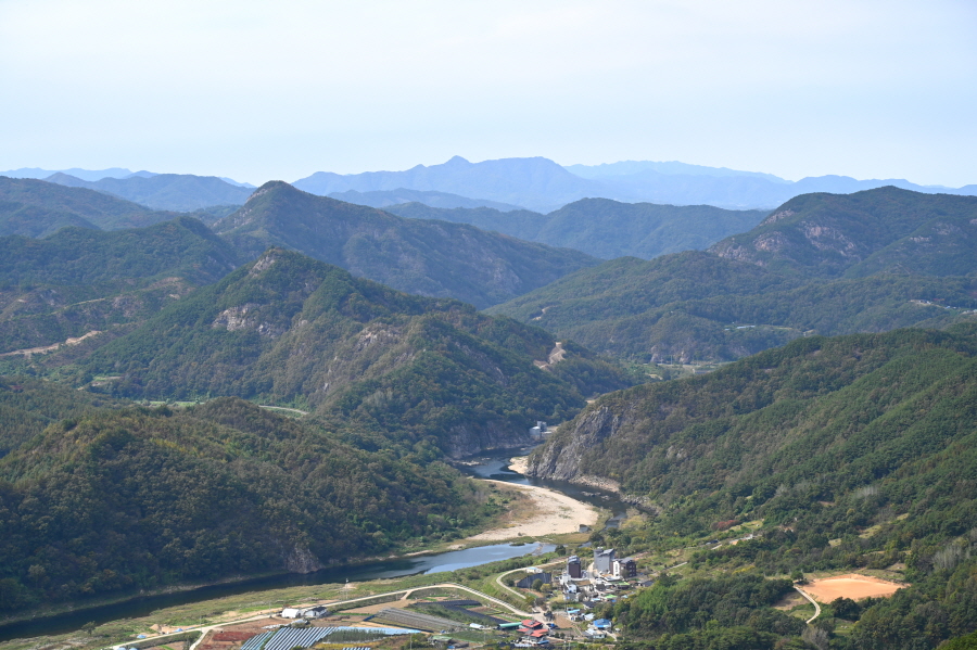 향로정에서 서북쪽으로 보면 베틀봉 갈선산 양각산이 물도리하는 내도리를 감싸며, 그 뒤 멀리 진악산과 대둔산이 솟았습니다. 동쪽으로 각호산 민주지산 석기봉 삼도봉과 남쪽으로 무주읍내를 두른 청량산 적상산 마항산 조항산 오른쪽 멀리 운장산도 가늠됩니다.