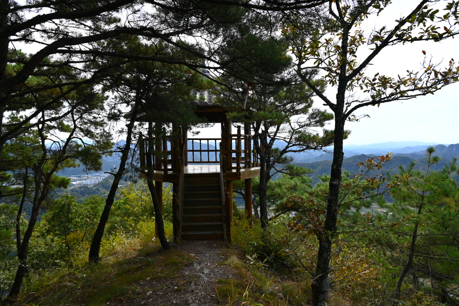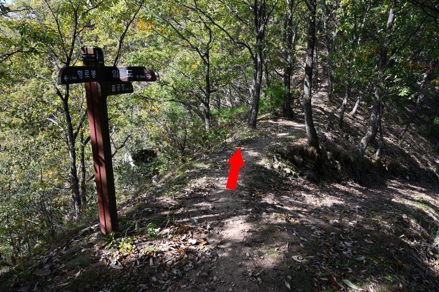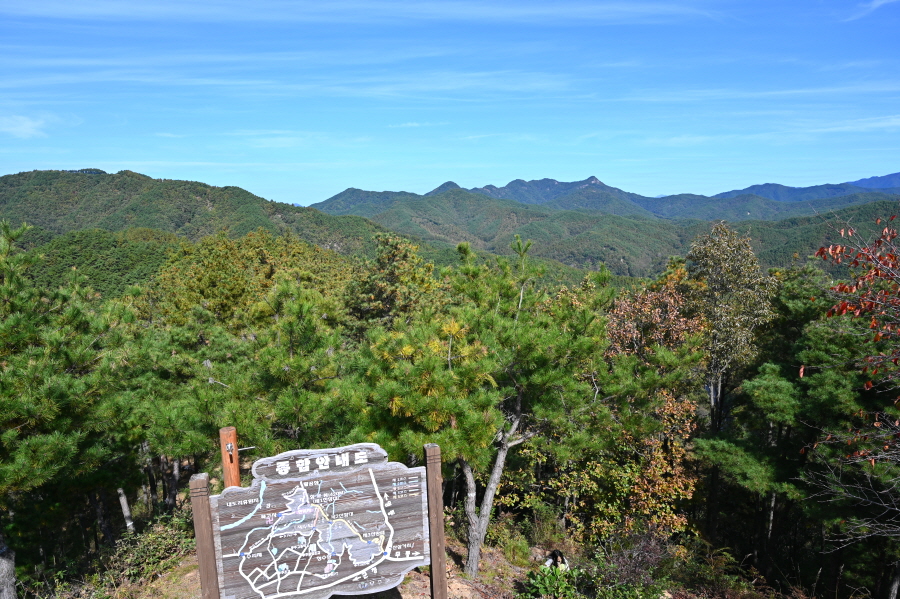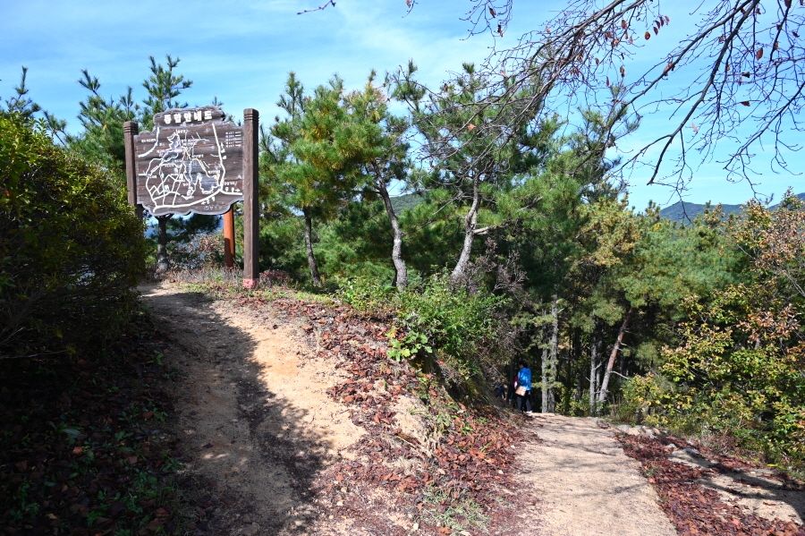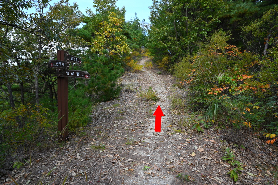 임도 갈림길에서 직진하면 덱 계단이 놓였고 된비알 길을 올라 약 30분이면 이정표가 섰는 능선 갈림길에 닿습니다. 여기서 왼쪽에 100m 떨어진 전망대를 갔다 옵니다.