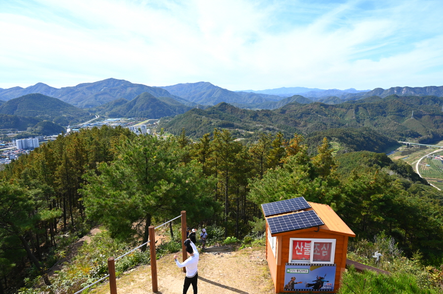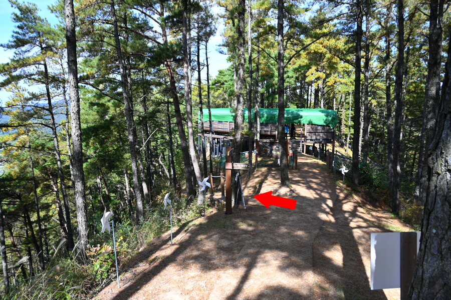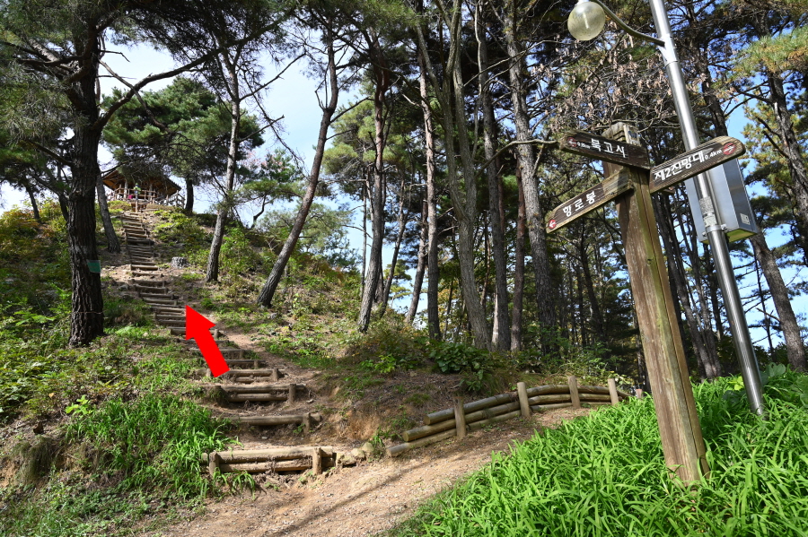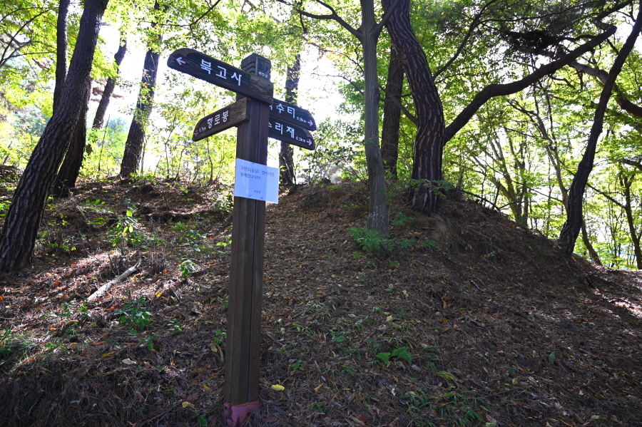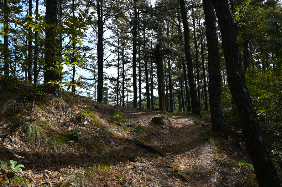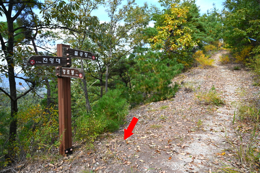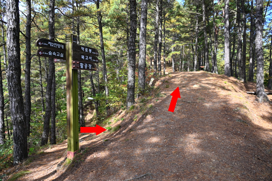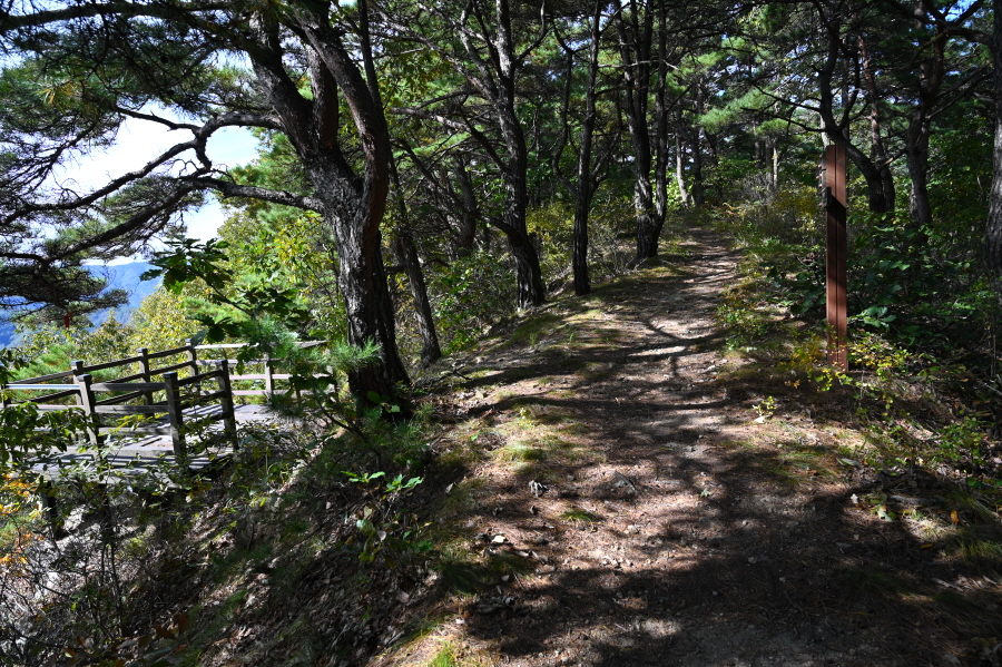 이제부터 이정표의 활공장을 따라갑니다. 두 번의 북고사 갈림길을 지나 운치 있는 소나무 숲 능선을 타면 안부에 전망 덱이 있습니다. 조망은 열리지 않습니다.