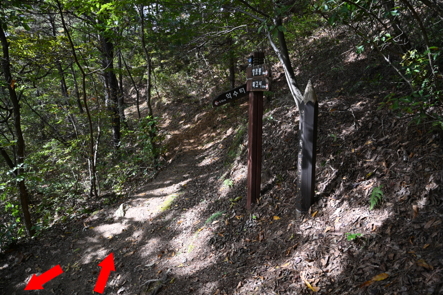 필자는 약수터(0.9㎞)·수리재(0.3㎞) 방향으로 직진해 고개를 넘습니다. 왼쪽은 향로봉으로 바로 가는 능선 길.