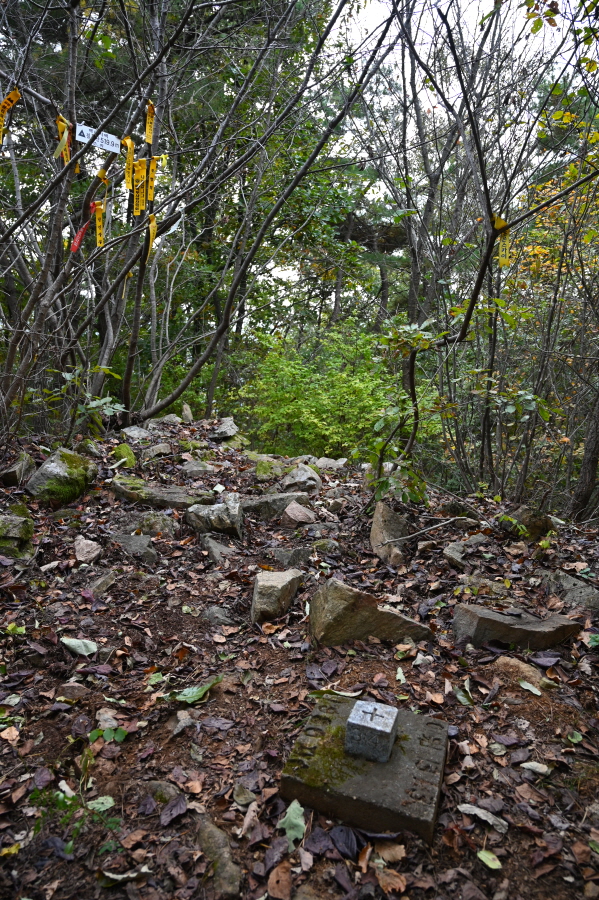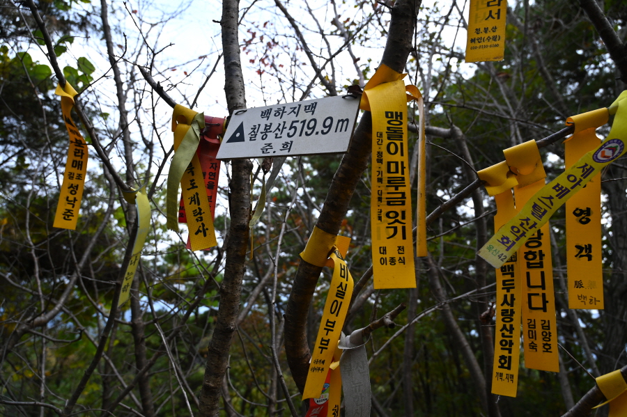 길옆에 아름드리 소나무를 베어 쌓아 두었습니다. 능선에 들어서면 칠봉산 까지 길 흔적이 뚜렷합니다. 정상은 삼각점이 있으며 조망은 없습니다.