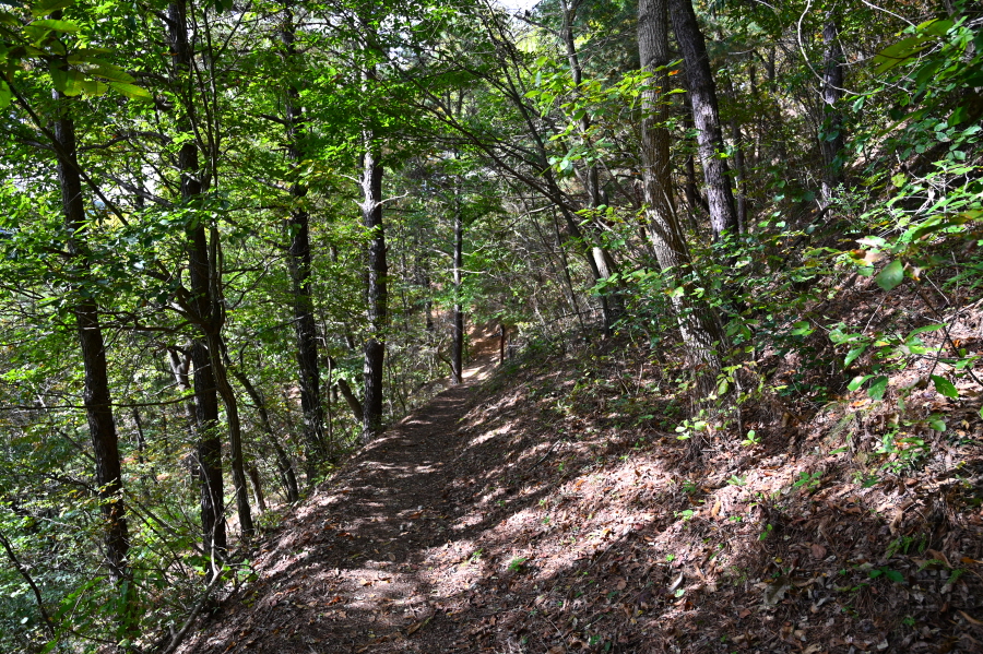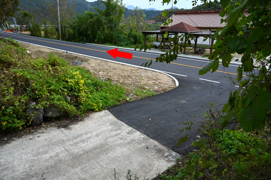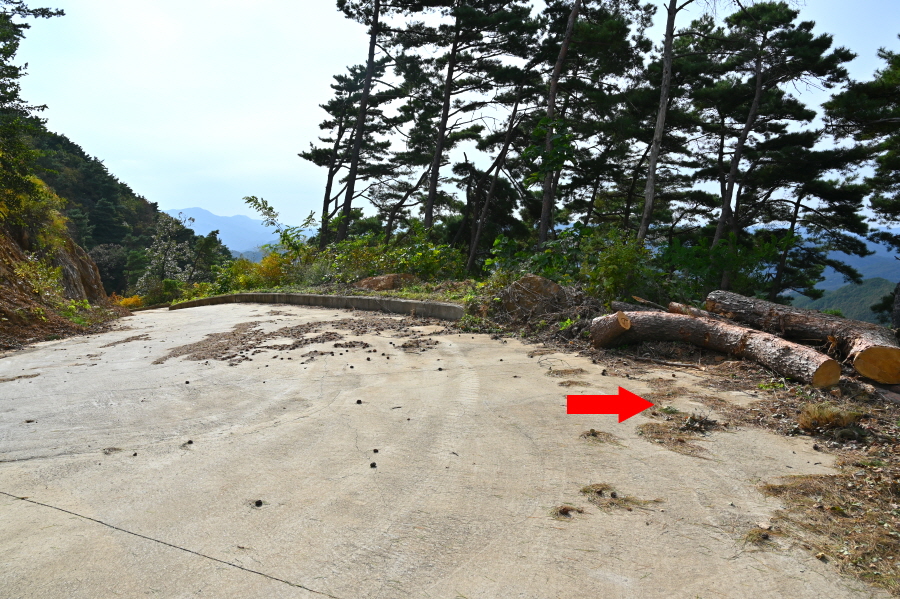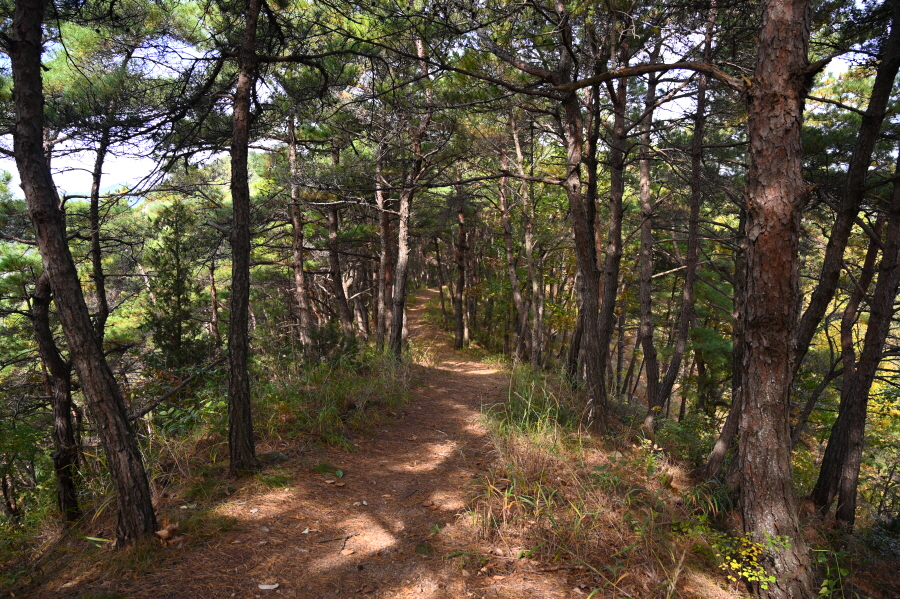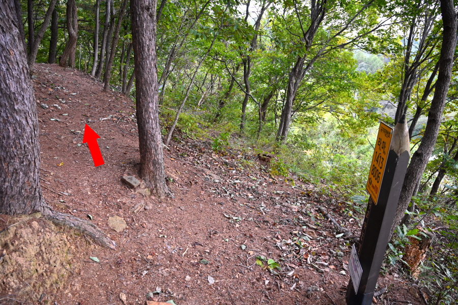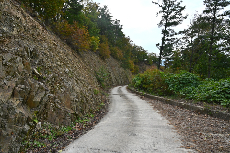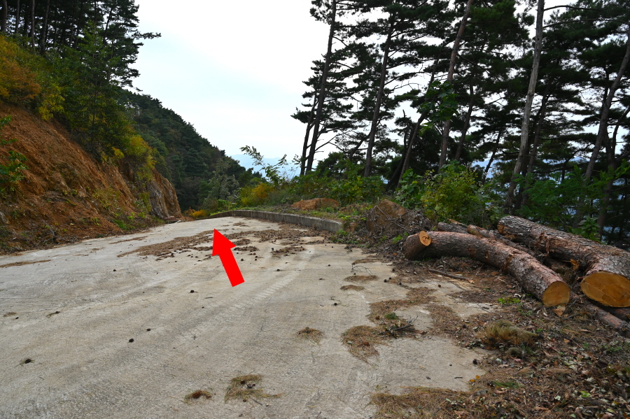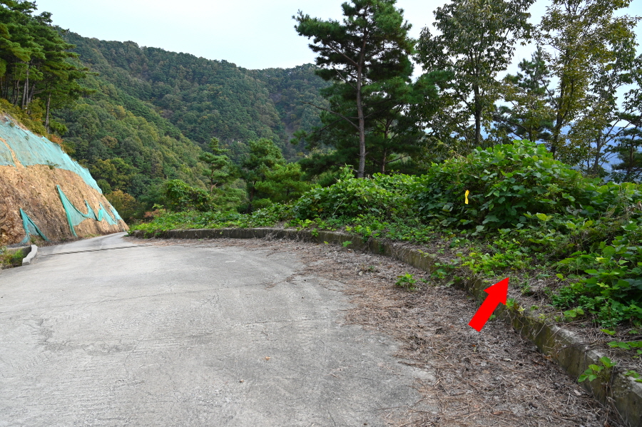 급경사 소나무 숲 능선을 지그재그로 내려가면 임도와 만난 뒤 농·특산물판매장 앞 도로에 떨어져 왼쪽으로 꺾습니다.