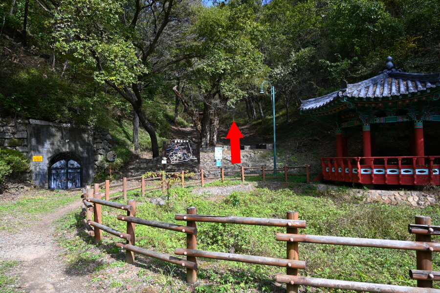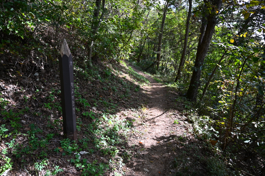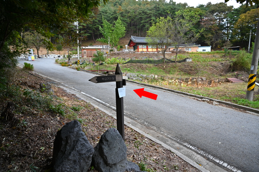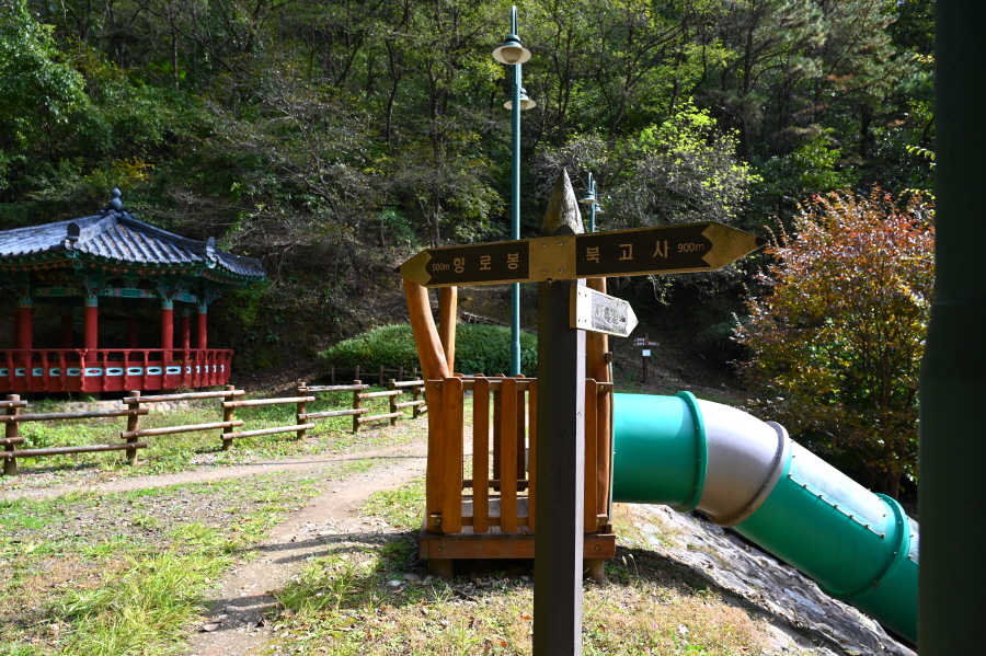 무주군 무주읍 읍내리 북고사 경내 주차장에서 출발합니다. 오른쪽 지장전 앞을 지나 요사채를 벗어나면 종합안내도가 서 있는 고개 갈림길이 나옵니다. ‘학교 가는 길’로 명명되어서 인지 몽땅 연필 형상의 팻말을 세워 놓아 옛 추억에 젖게 합니다.