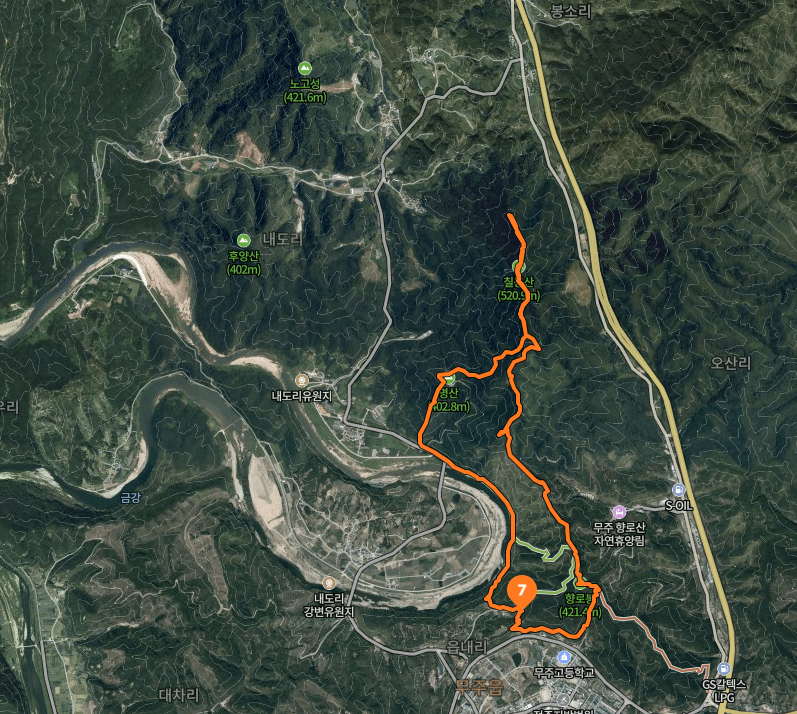 필자는 금강이 내도리를 물도리 하며 흐르는 강변을 따라 무주읍으로 등교하던 학생들이 걷던 금강 맘새김 길 2 코스 ‘학교 가는 길’과 물도리 전망대인 향로봉(香爐峰·421.5m)을 연결해 찾았습니다.