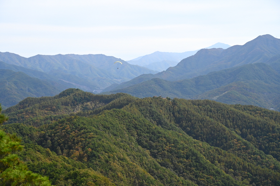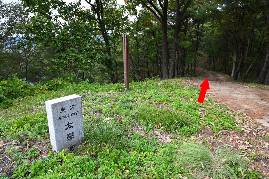 앞서 갈림길에서 활공장(0.5㎞)으로 직진해 5분이면 동방 태학사 표석이 세워진 콘크리트 임도와 만납니다. 왼쪽으로 5분이면 동서남북으로 조망이 열리는 활공장입니다.