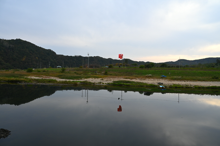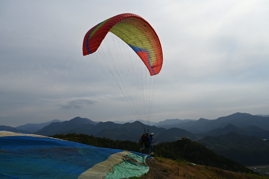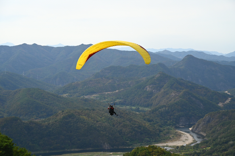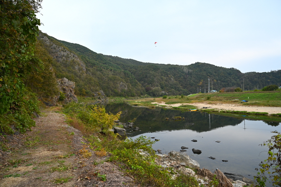 주말이라 패러글라이딩 체험객이 가이드와 이륙을 준비 중이었습니다. 바람을 받으며 땅을 박차 오르는 패러글라이딩이 오늘 따라 무척 부러웠습니다. 하늘에 올라 무주의 산과 물도리하는 금강을 상상하며 콘크리트 임도로 나섭니다.