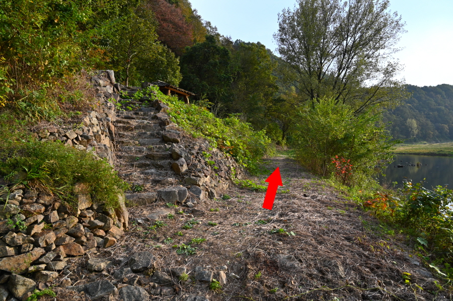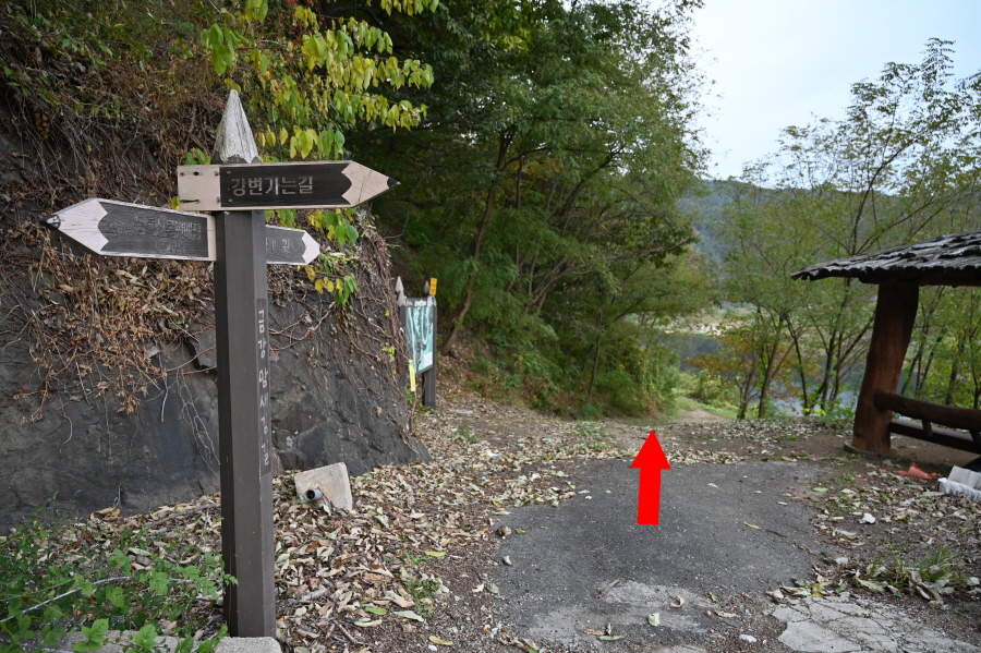 너른 길은 강물을 거슬러 향로봉으로 올라가는 원두막 쉼터를 거쳐 다시 나오는 갈림길에서 왼쪽입니다.