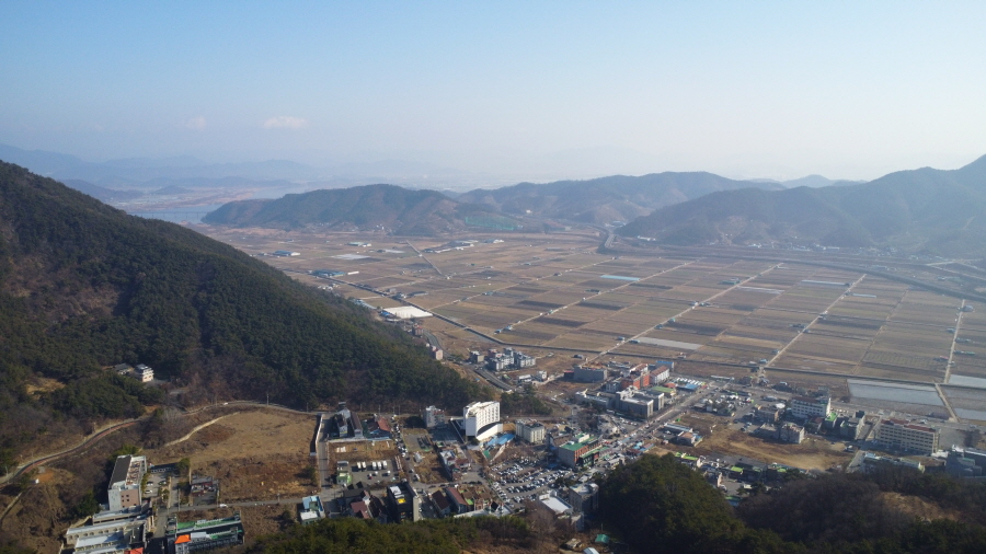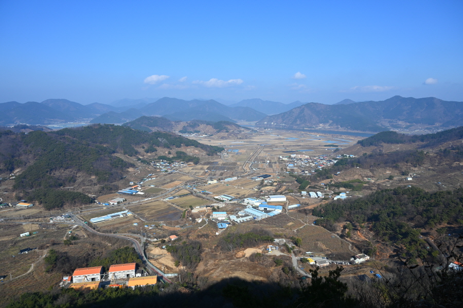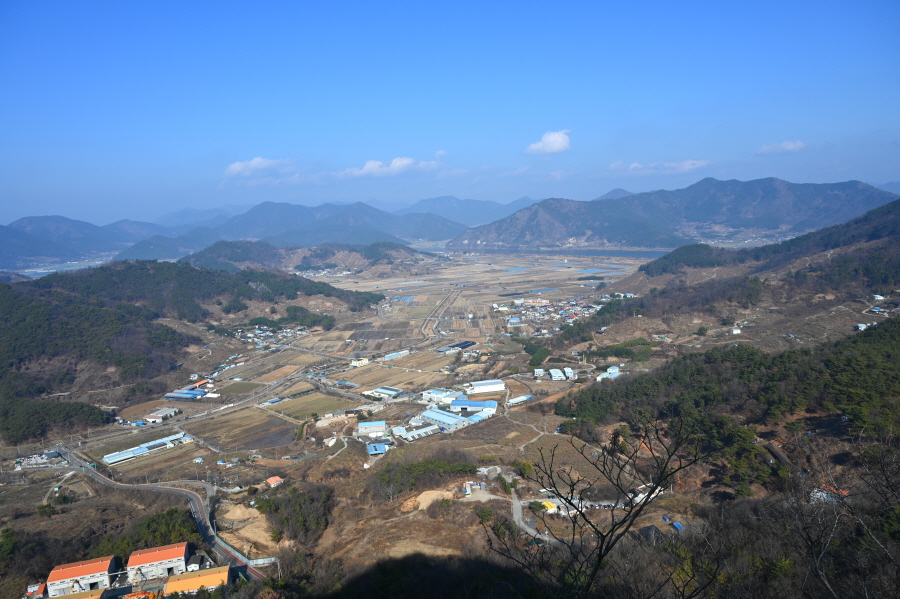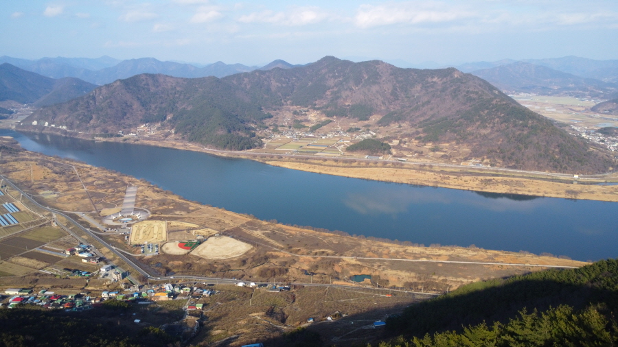 발아래 북면수변생태공원과 낙동강 건너 큰 산은 처녀봉입니다. 그 왼쪽에 강태봉이 봉긋합니다. 두 산 가운데는 부곡온천 뒷산인 종암산과 덕암산이며, 멀리 영축산 변봉 화왕산 관룡산 영취산 등이 확인됩니다. 직진하면 낙동강이 흐르는 바깥신천으로 내려갑니다.