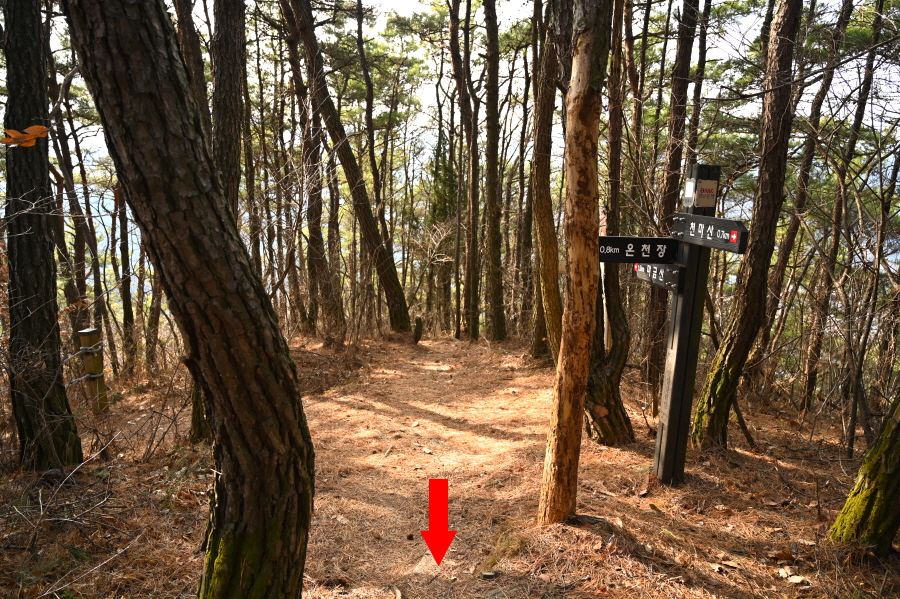 하산은 앞서 갈림길로 되돌아 간 뒤 왼쪽 온천장(0.8㎞)으로 꺾습니다.
