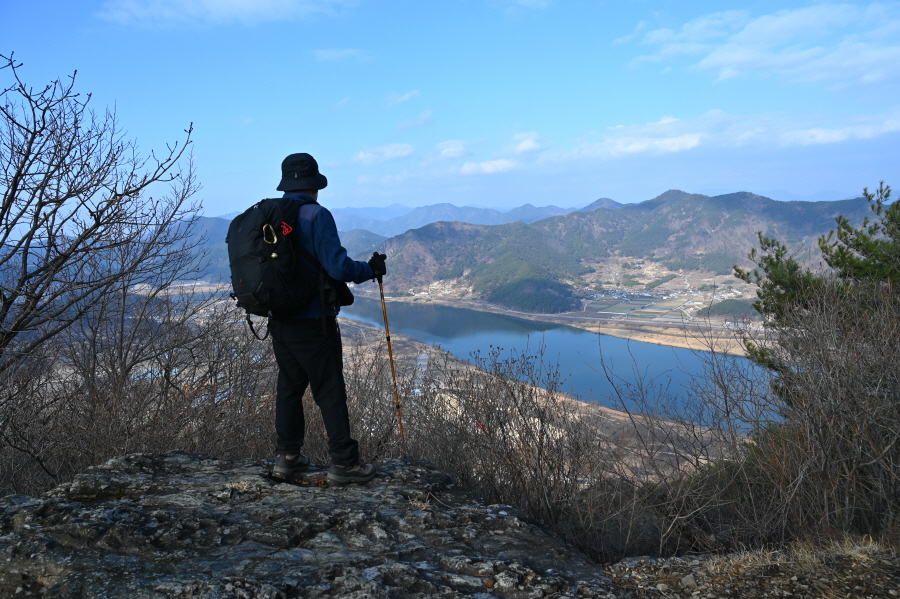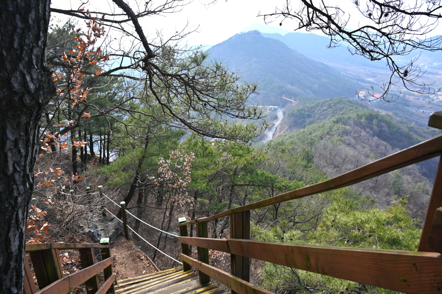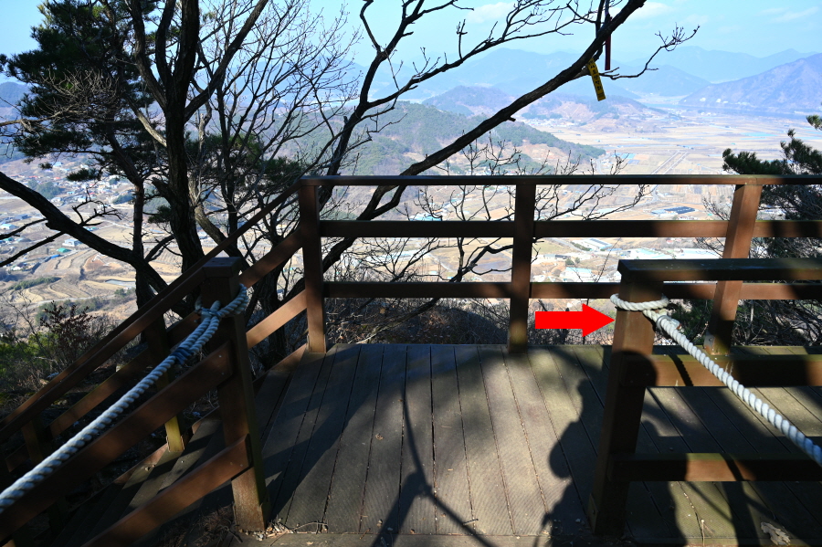 천마산은 오른쪽인데, 왼쪽 옥녀봉 방향 덱 계단을 내려가면 오른쪽에 바위 전망대가 있어 잠시 보고 갑니다. 정면 낙동강 건너 창녕의 명산이 시원하게 펼쳐집니다.