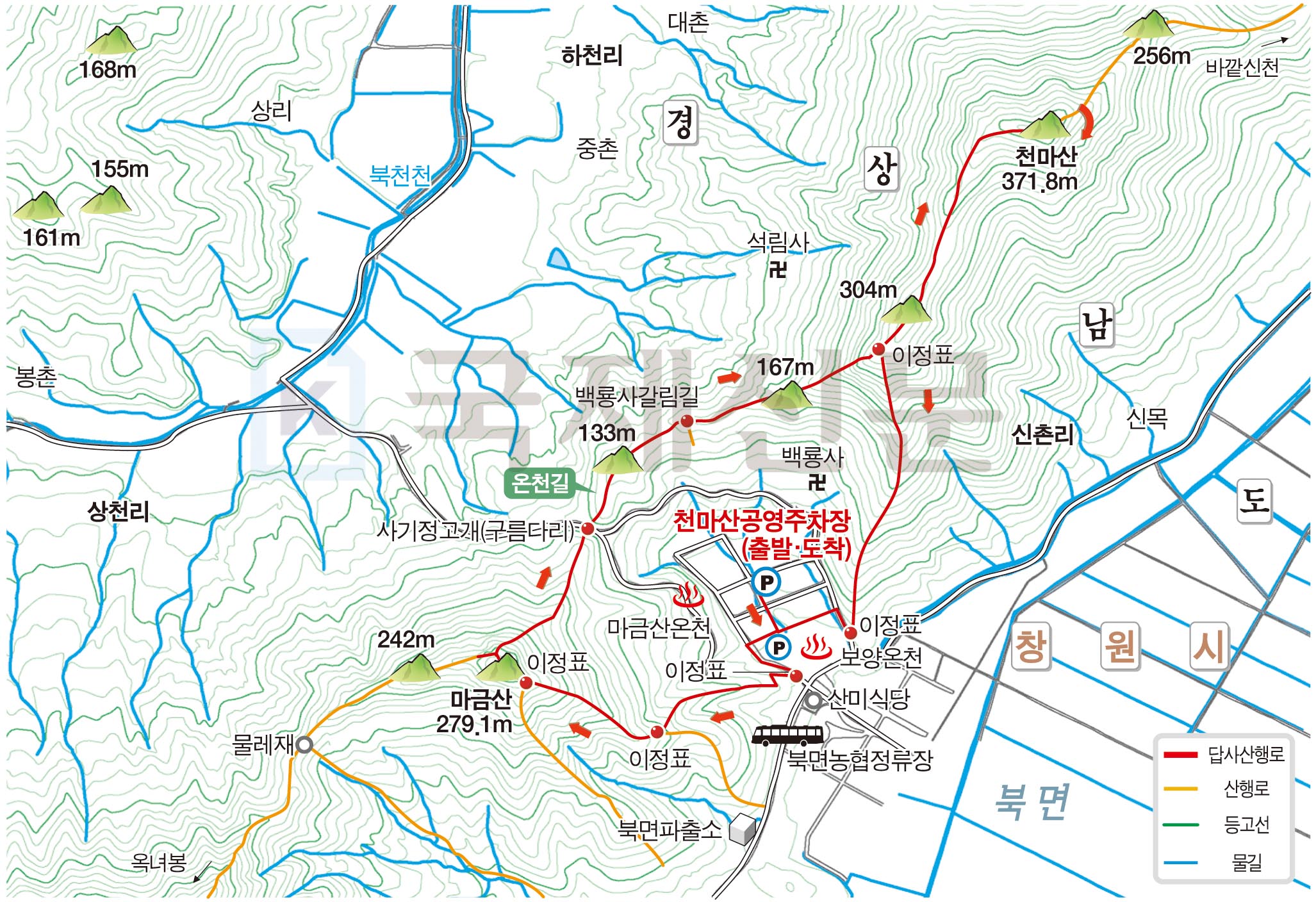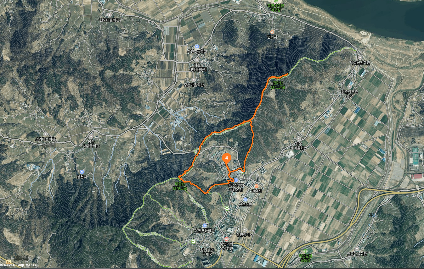 산행경로는 다음과 같습니다. 천마산공영주차장~마금산원탕보양온천 앞 들머리~마금산·북면우체국 갈림길~마금산·온천초등학교 갈림길~마금산 정상~옥녀봉 갈림길~전망대~온천구름다리~백용사 갈림길~천마산·온천장 갈림길~천마산 정상~천마산·온천장 갈림길~도로(천마산 입구)~천마산공영주차장에 되돌아오는 원점회귀산행입니다. 산행거리는 약 5㎞이며, 3시간 안팎 걸립니다.