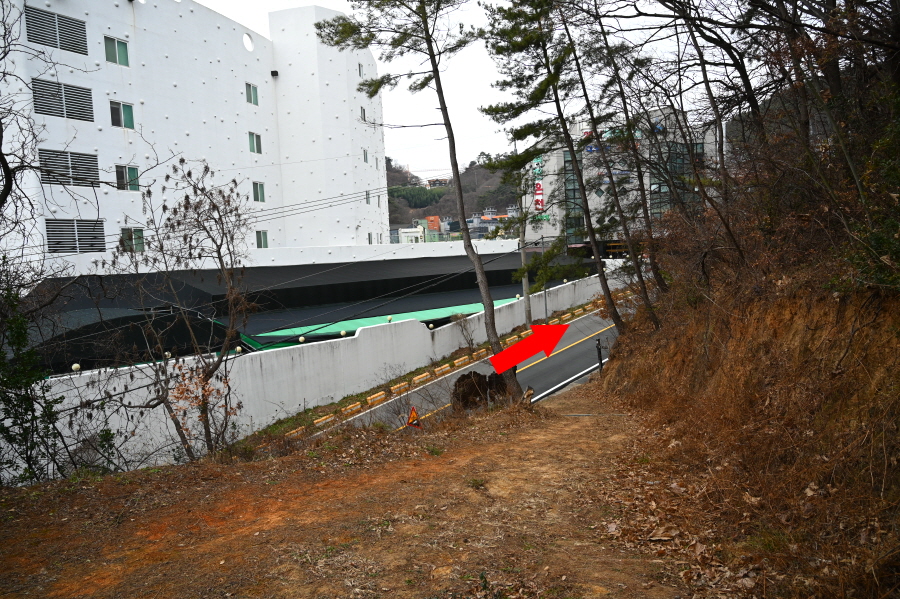 지그재그 길을 따라 20분이면 천마산 입구 도로에 떨어집니다. 여기서 공영주차장과 보양온천은 오른쪽이며. 버스정류장은 왼쪽으로 갑니다.