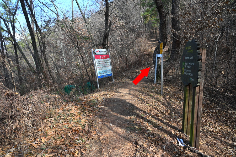 15분이면 왼쪽 북면우체국에서 올라오는 길과 만나 마금산(0.5㎞)은 직진합니다. 3,4개의 운동기구를 지나 등산로는 잠시 치받아 오릅니다. 오른쪽 건너편에 가야할 천마산이 보입니다.