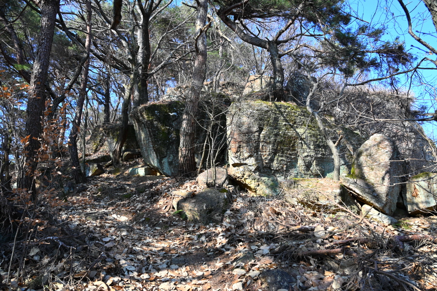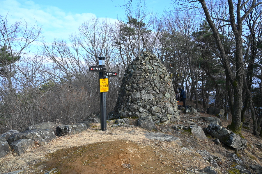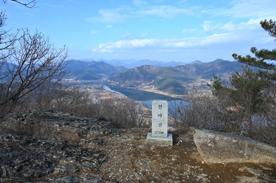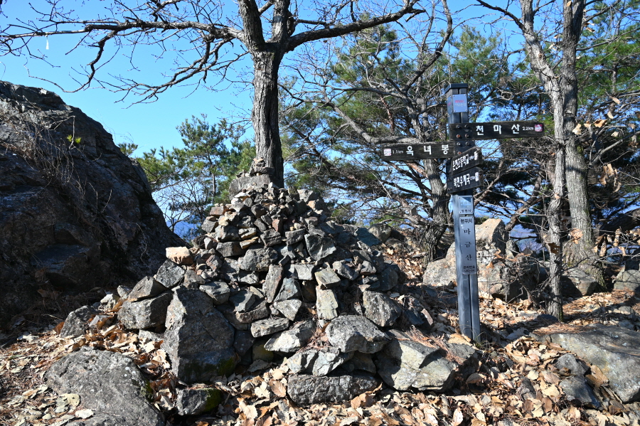 천마산(0.7㎞)은 직진해 부드러운 능선을 타고 15분이면 도착합니다. 큰 돌탑과 정상석이 서 있으며, 북쪽으로 조망이 시원하게 열립니다.