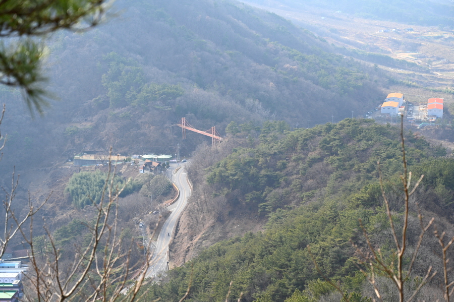 이곳을 지나면 산길은 잠시 가파르게 내려가다 평탄해 집니다. 사거정 고개에서 올라오는 갈림길 한 곳을 거쳐 정상에서 20분이면 마금산 온천구름다리를 건넙니다.