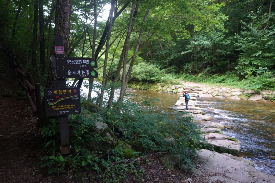 가동이 중단된 인공폭포를 돌아 용림교를 건너면 용소와 군립공원주차장으로 가는 징검다리가 나옵니다. 우천 때는 왼쪽에 우회하는 산길이 있습니다.