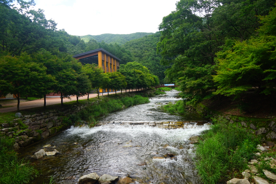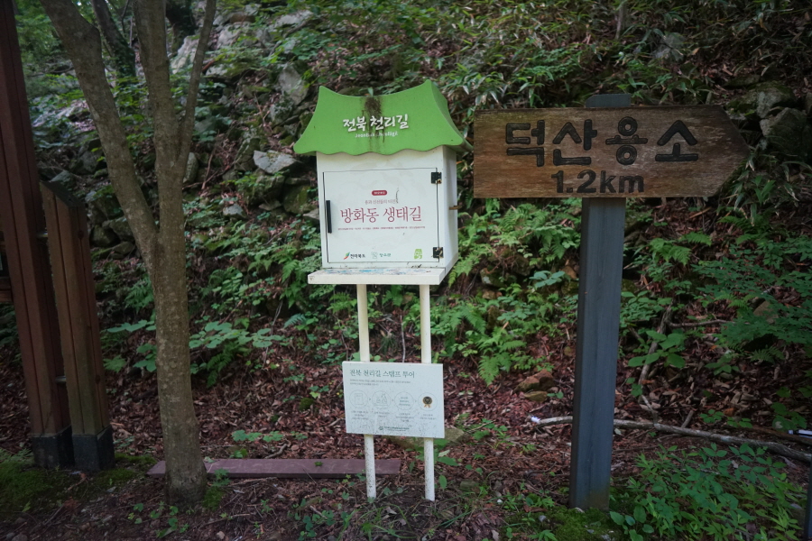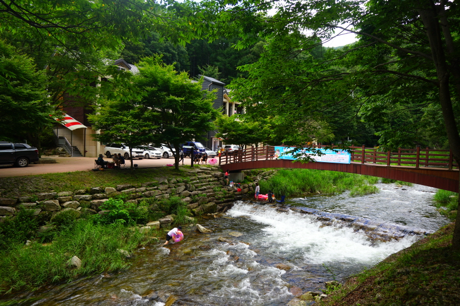산림문화휴양관 앞에서 덕산용소(2.6㎞)·숲속의 집 방향 오른쪽 콘크리트 다리를 건너면 캠핑장에서 오는 길과 만납니다.