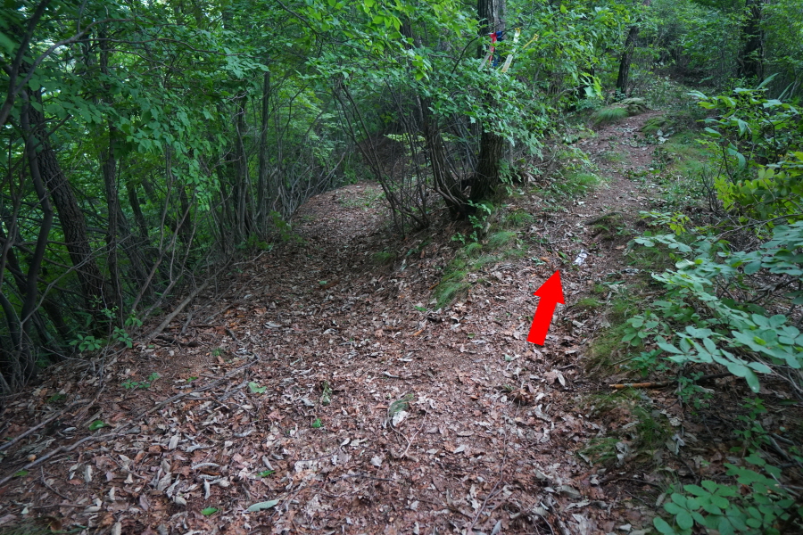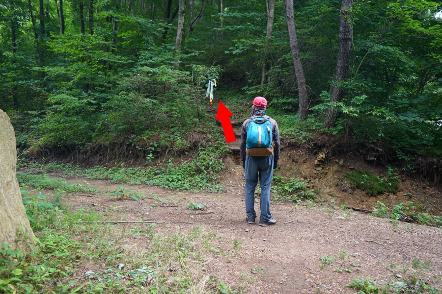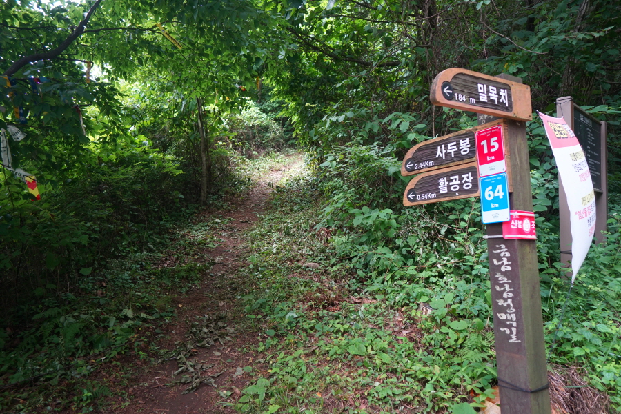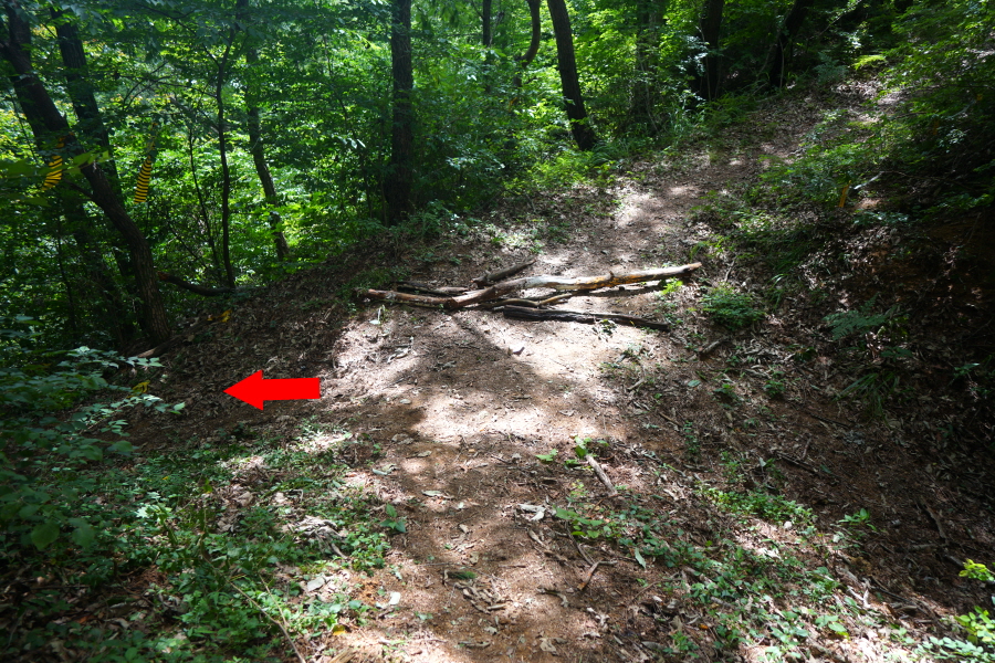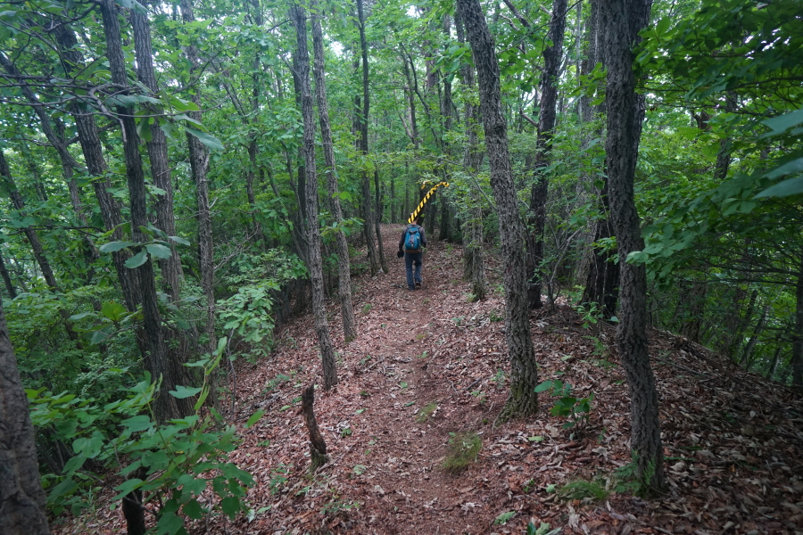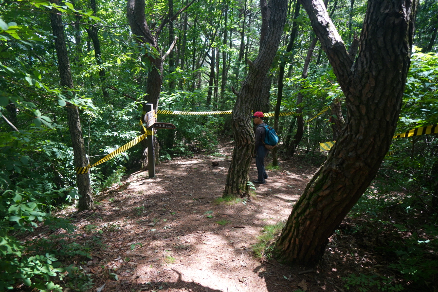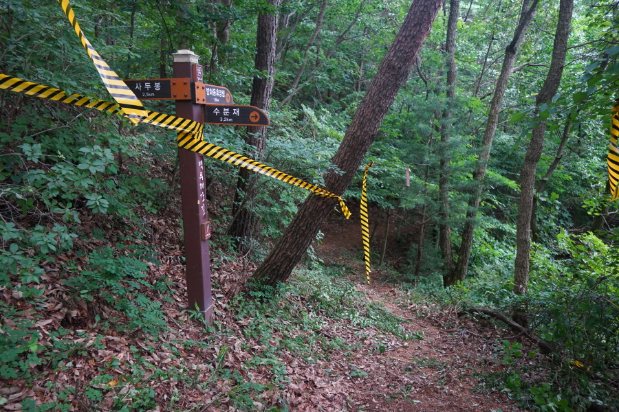 개활지가 오른쪽에 나오고 완만하게 이어지던 능선은 약 50분이면 이정표가 서 있는 갈림길에 닿습니다. 오른쪽 수분재(3.2㎞)로 꺾습니다. 아무 표시가 없는 직진 능선도 방화동 휴양림으로 갑니다. 지난 7월 3일 ‘2024 쿨밸리트레일레이스’ 경기를 사두봉~덕산계곡 일원에 열면서 노란 테이프로 산길을 막아 놓았습니다.