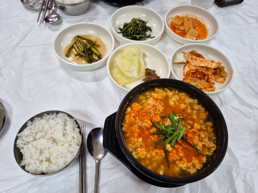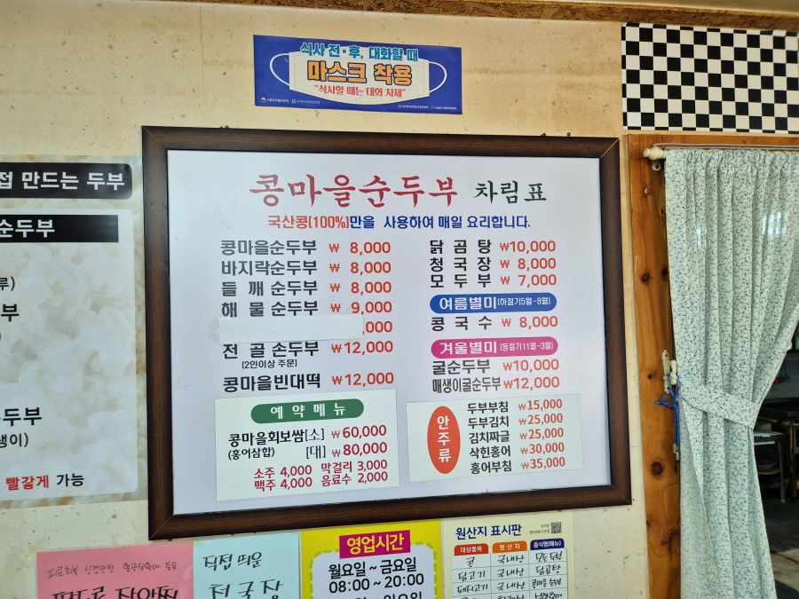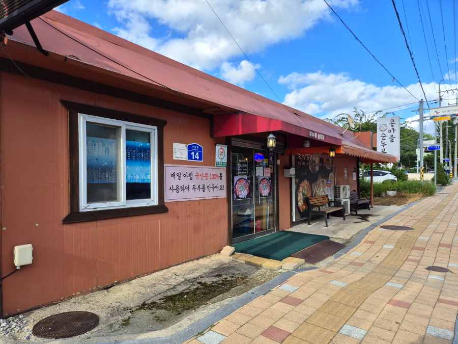 장수군민이 즐겨 찾는다는 전북 장수군 장수읍 시장로 14 '콩마을 순두부( 063-353-3718)'입니다. 매일 아침 국산콩 100%를 사용하여 두부를 만든다는 문구가 눈에 띈다.