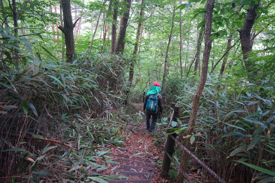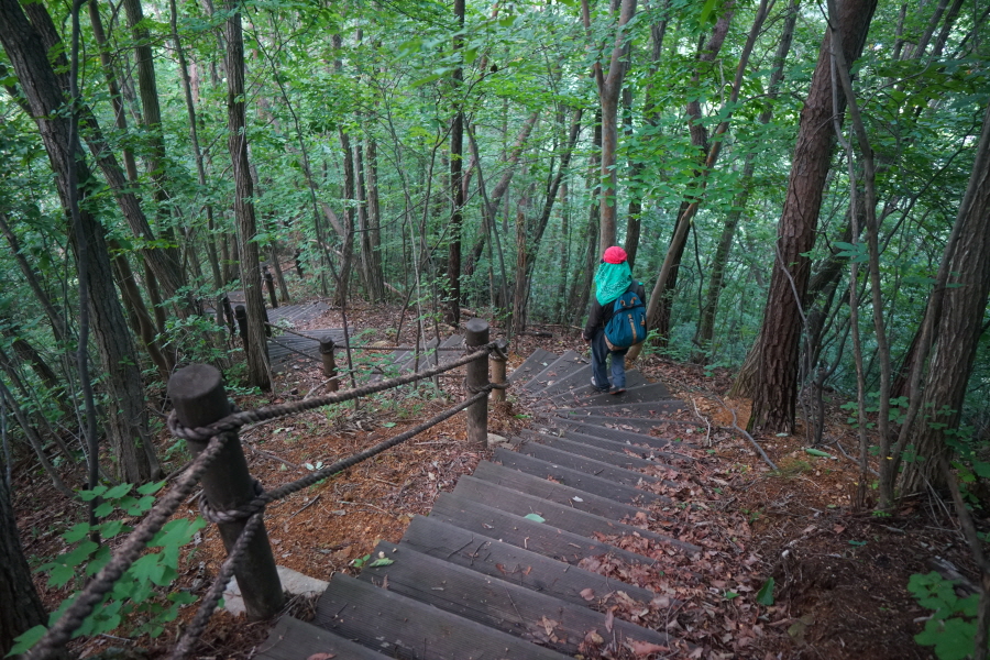 벤치가 놓인 너른 쉼터를 거쳐 침목계단을 가파르게 내려갑니다.