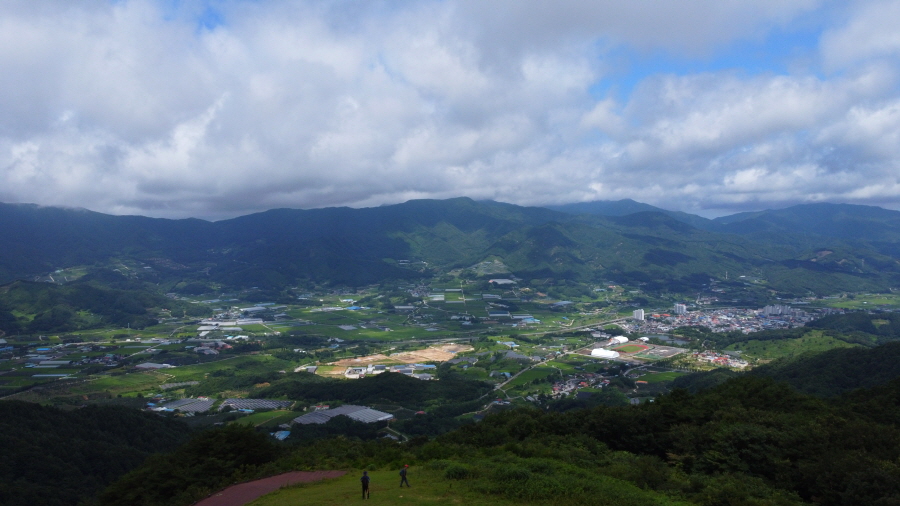 멀리 적상산이 가물거리며. 북쪽 발아래 분지인 장수읍을 팔공산과 천상데미(깃대봉)가 포근하게 감싼 모양입니다.