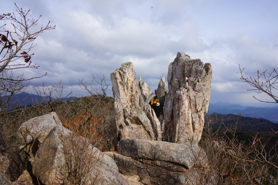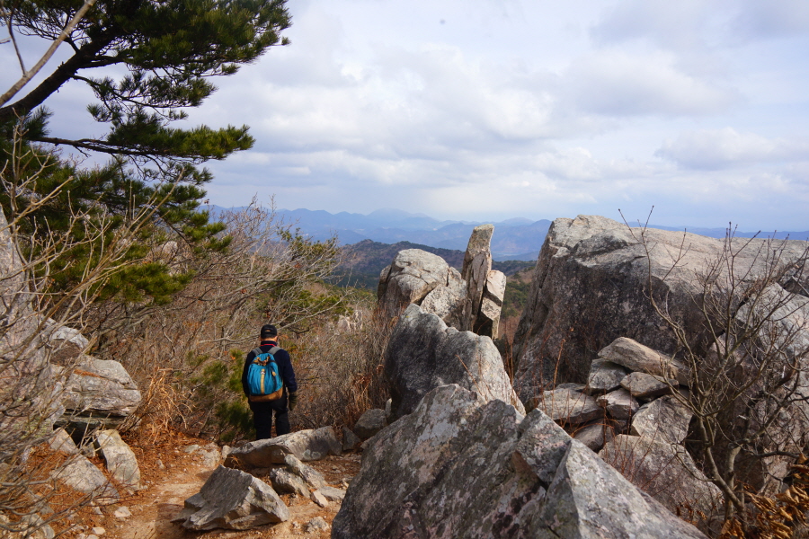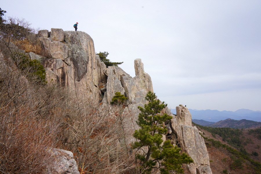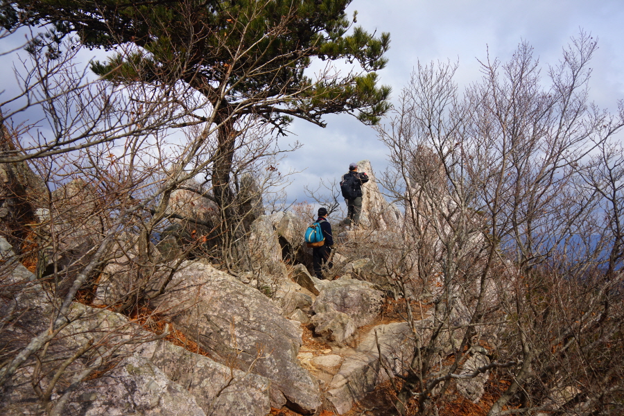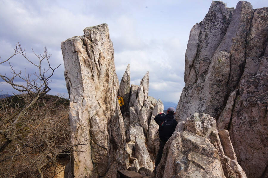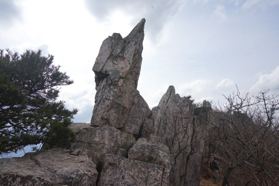 1망루는 정상석 오른쪽으로 갑니다. 10분이면 삐쭉삐죽한 바위가 창같이 꼽혀 있어 왕관바위로도 불리는 닭벼슬바위를 지나 갈림길과 만납니다.