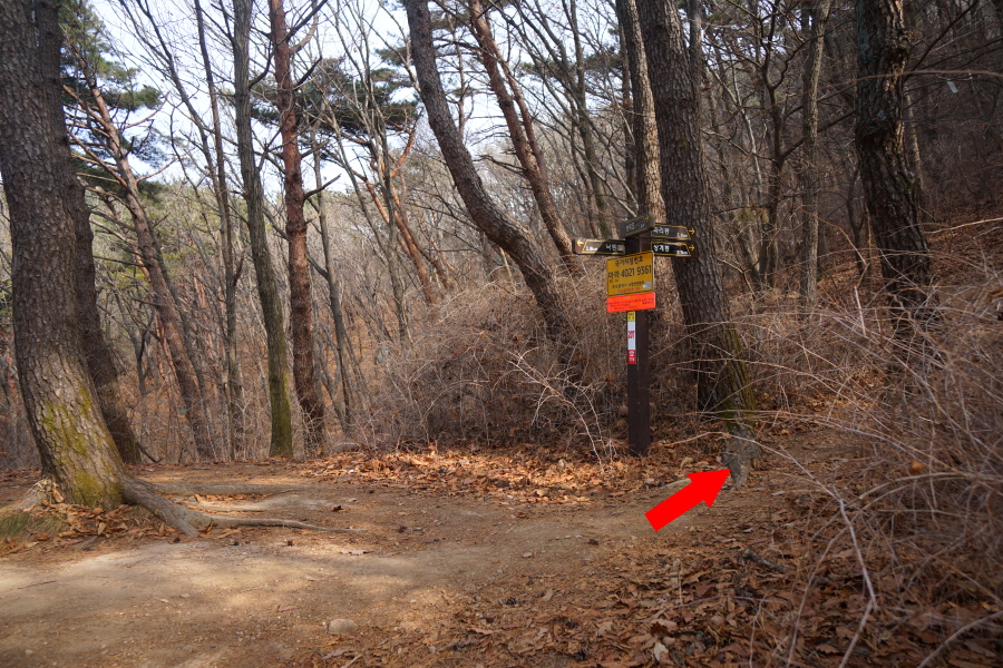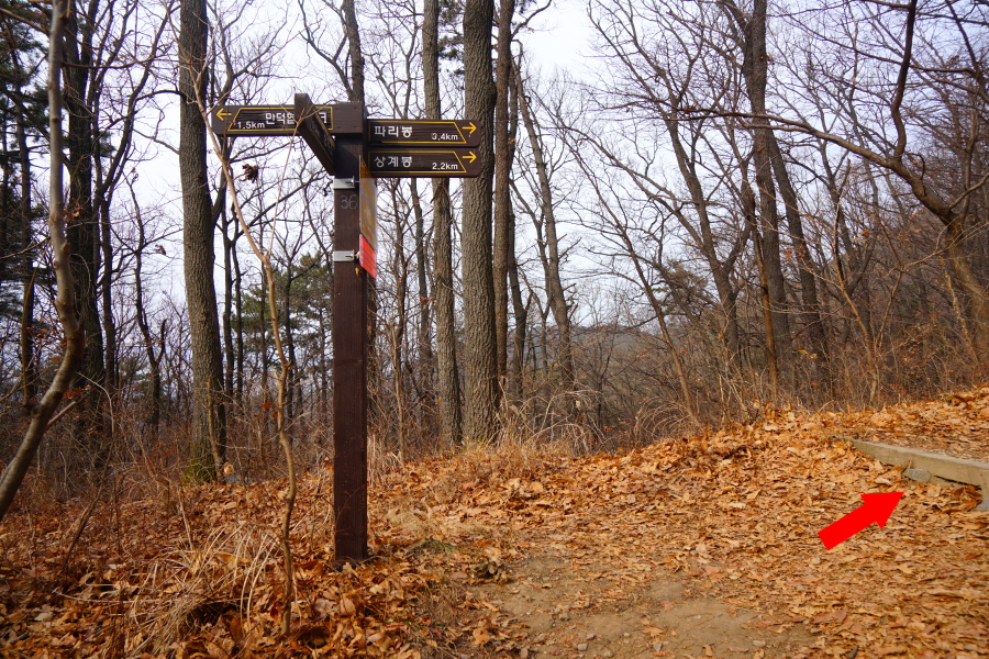상계봉(2.2㎞)·파리봉(3.4㎞)은 오른쪽으로 꺾습니다. 잘못된 이정표로 상계봉까지 거리가 더 늘어나 있습니다. 1분이면 '국가지점번호 마라 4018 9303' 노란 표지판 갈림길에서 왼쪽 너른 길을 갑니다. 오른쪽은 상계봉으로 능선을 직등하는 된비알 길입니다.