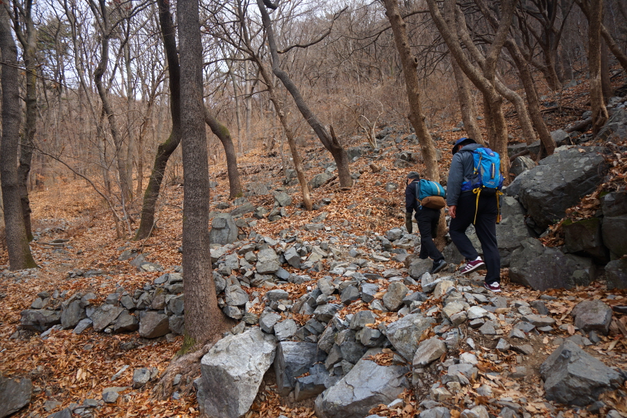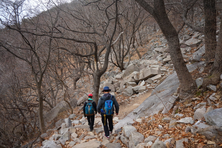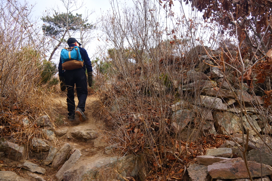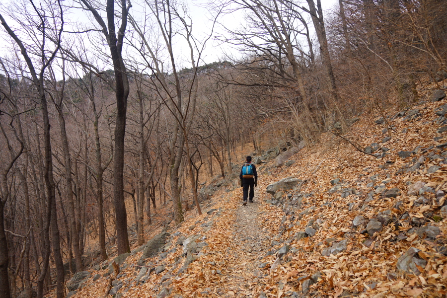 완만하게 도는 산비탈 길로 너덜지대가 나오면서 가팔라져 약 20분이면 사거리 능선에 섭니다. 오른쪽 상계봉(0.8㎞)·파리봉으로 향합니다. 왼쪽은 덕천동의 낙동고에서 올라오는 길입니다.