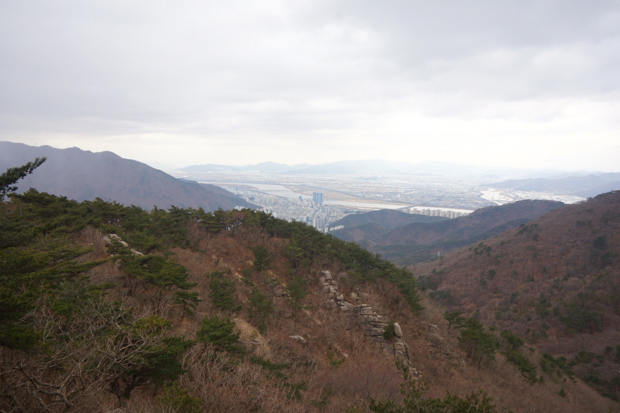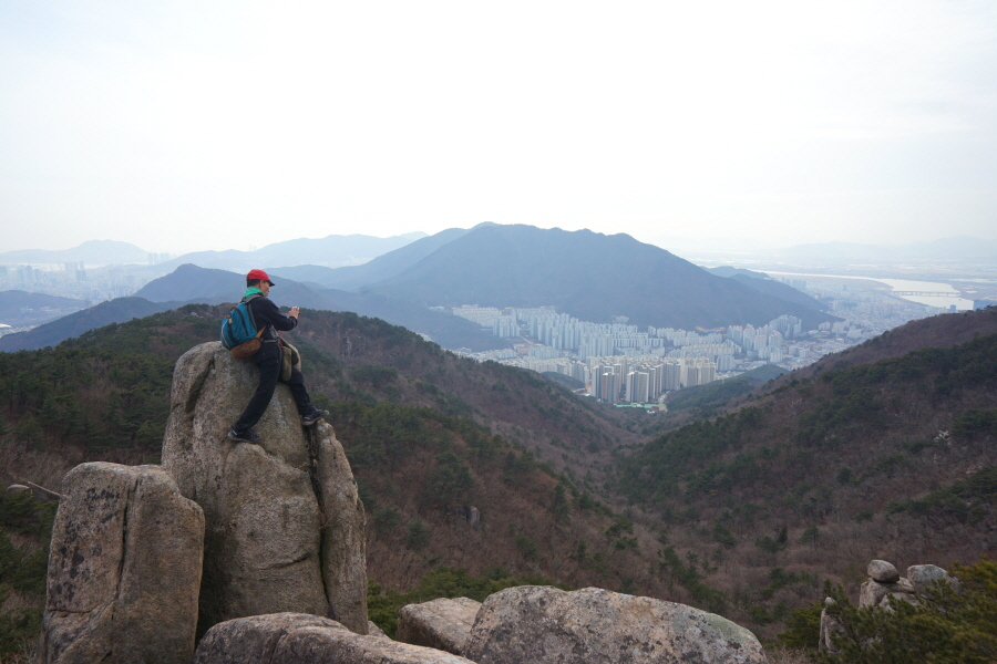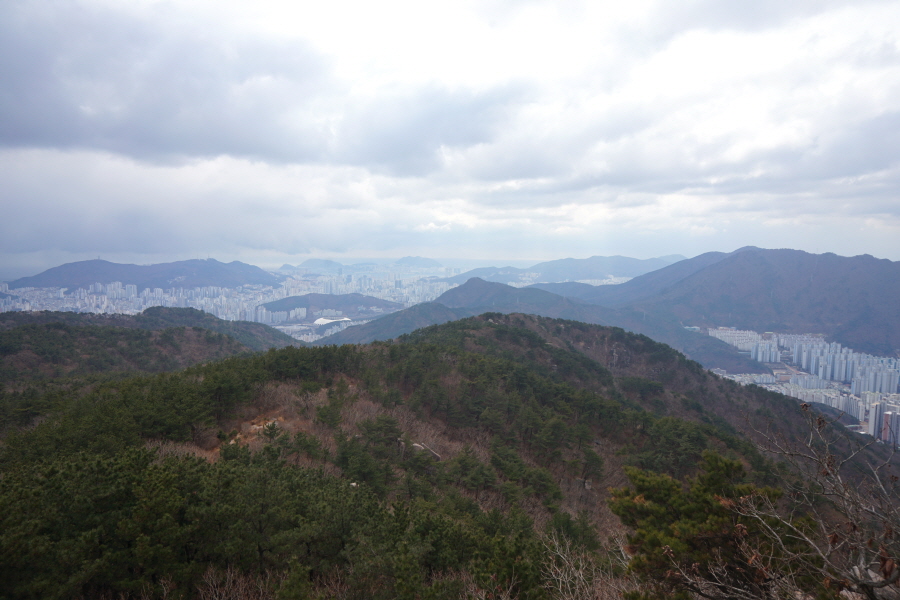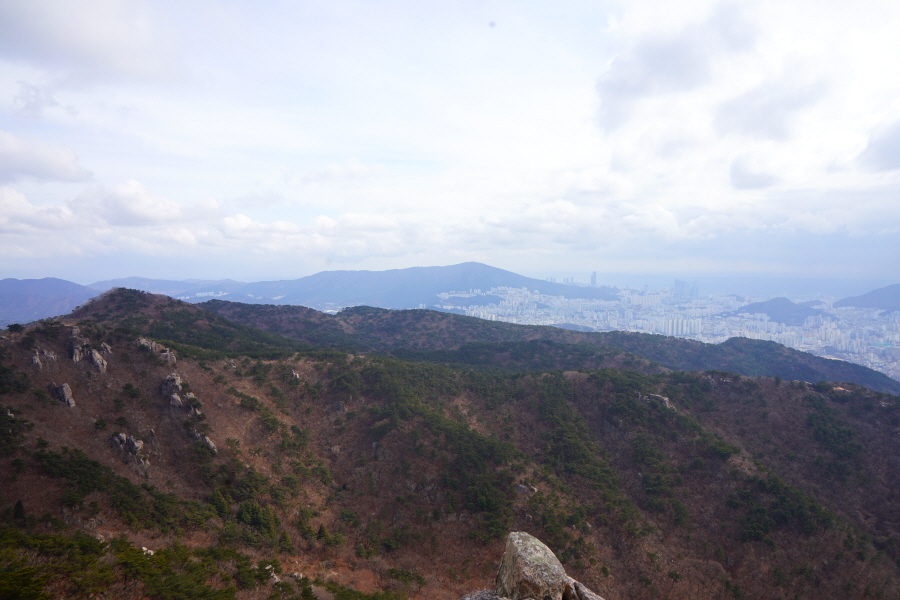 약 20분이면 상계봉 정상석과 마주 하며 전망은 남쪽으로 열립니다. 왼쪽 달음산에서 시계 방향으로 장산 황령산 봉래산 엄광산과 만덕동에 들어선 수많은 아파트 뒤로 우뚝한 산은 백양산입니다.