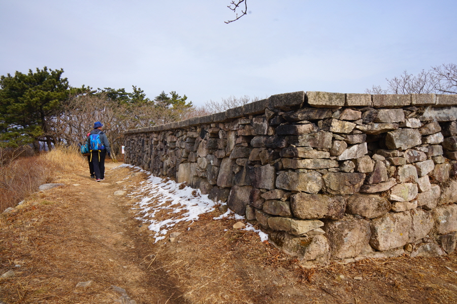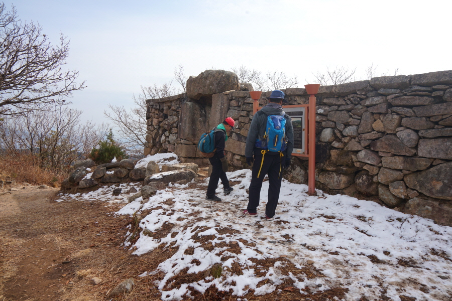 3분이면 석축만 남은 1망루에 도착합니다. 여기서 오른쪽 남문(1.0㎞)으로 꺾습니다. 직진은 파리봉에서 오는 길입니다. 두 봉우리가 얼마 안 떨어져 있어 연결하는 산행을 해도 괜찮습니다.