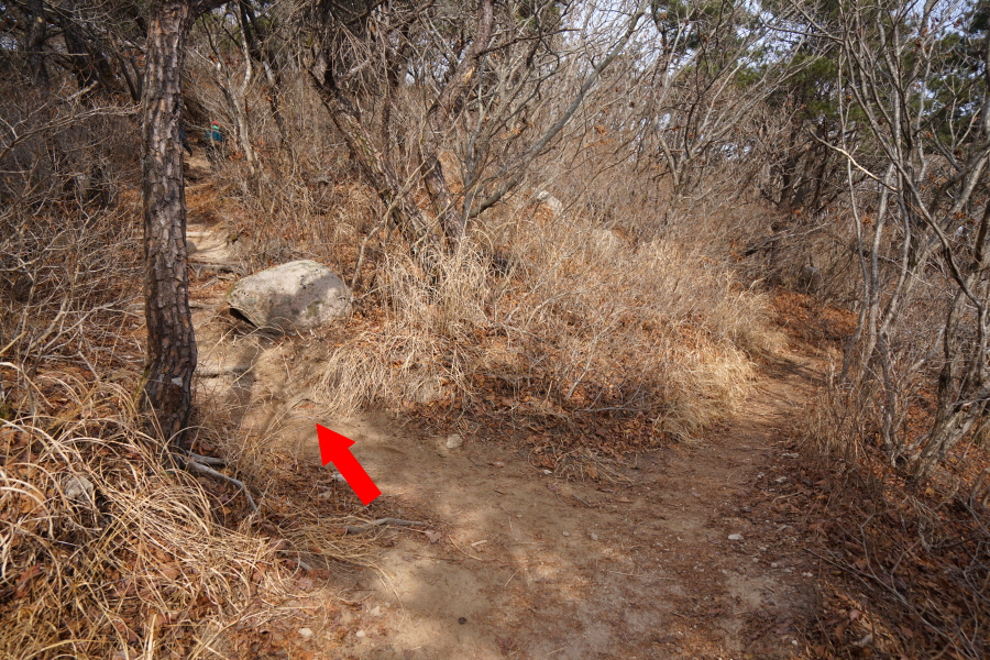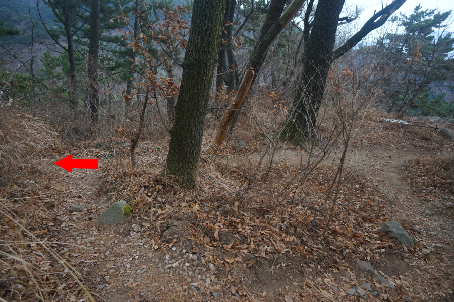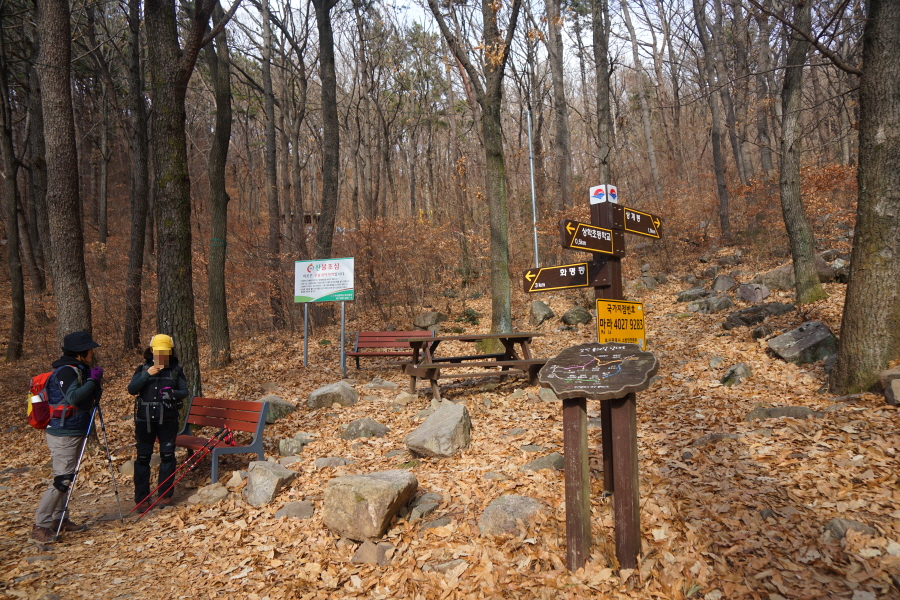 5,6분이면 안부 사거리에 떨어집니다. 석불사는 남문 방향으로 능선을 직진합니다. 오른쪽은 출발했던 상학초교로 하산하는 길이며, 왼쪽은 수박샘을 거쳐 남문으로 향하는 기존 등산로 입니다.