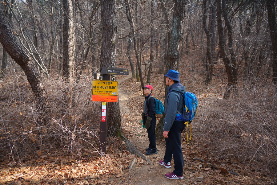 직진형 오른쪽 길은 계곡을 따라 금정산 주능선의 1망루와 석불사 갈림길인 헬기장 사이 안부로 바로 올라가니 주의합니다. 배씨 묘를 지나 살짝 오르막을 치면 만덕협성파크에서 올라오는 지능선 삼거리와 만납다.